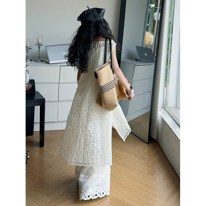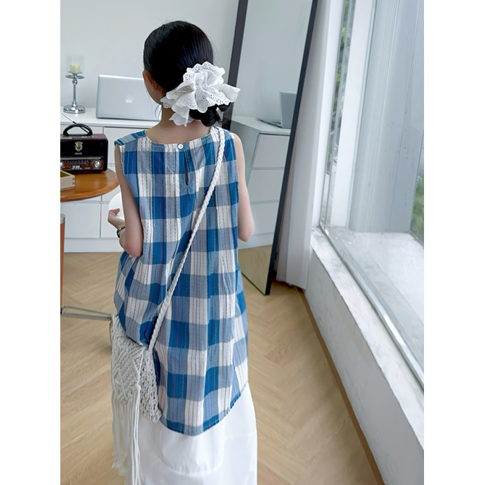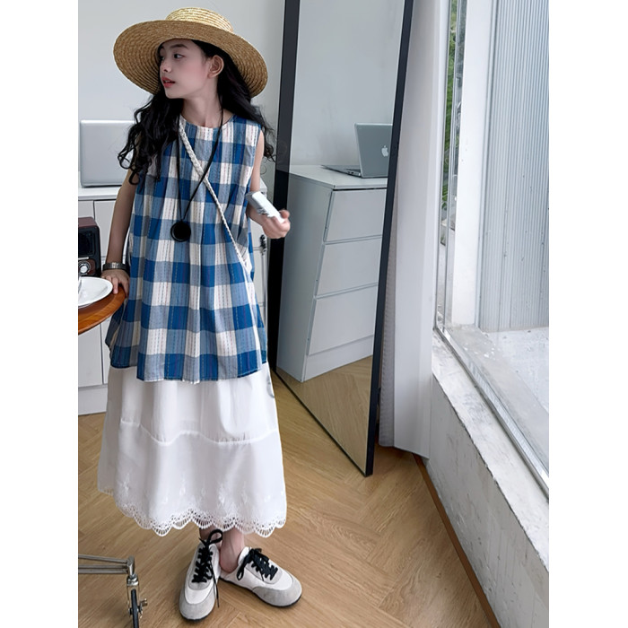 親子裝2025超火母女裝藍色格子白色半身裙兩件套中大童洋氣新款夏