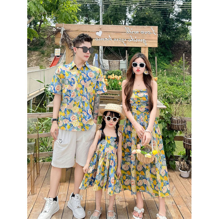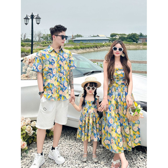 三亞海邊度假親子裝一家三口四口花色襯衫油畫母子母女裝沙灘短袖