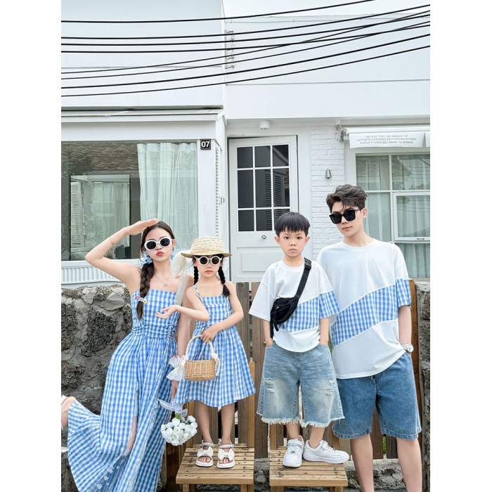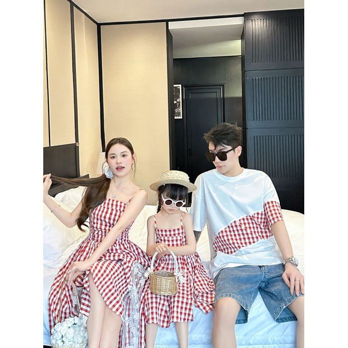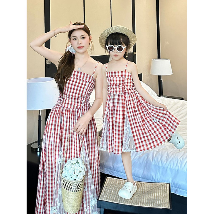 三亞海邊親子裝母女裝2025新款夏一家三口吊帶紅色藍色格子連衣裙