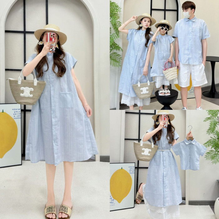 高級一家三四口襯衫夏季條紋短袖襯衣母女裝裙親子裝寬松度假休閒