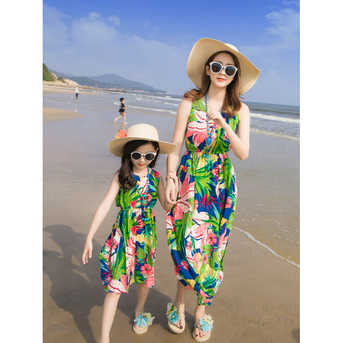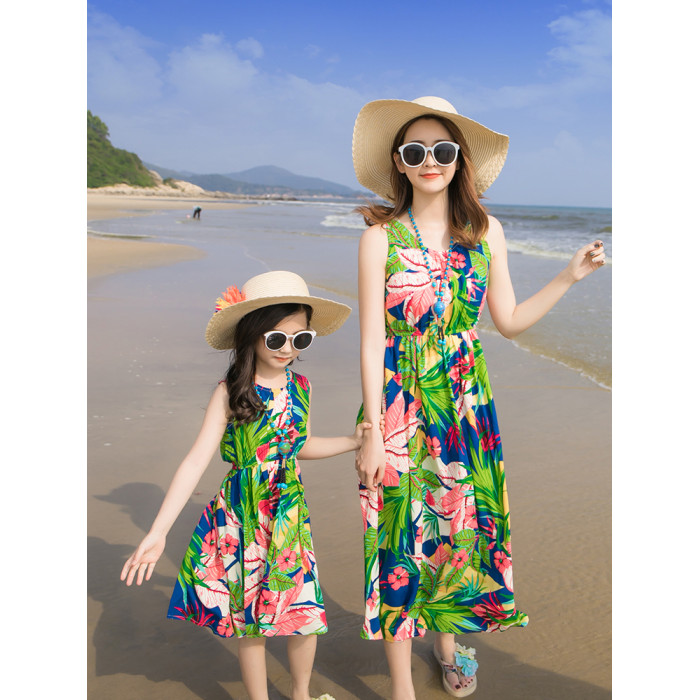 沙灘親子裝夏裝2025新款潮一家三口四口全家三亞海邊母女連衣長裙
