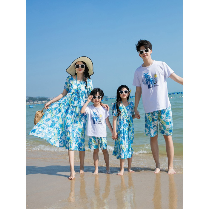親子裝一家三口四口沙灘海邊母女連衣裙夏季大碼三亞度假短袖套裝