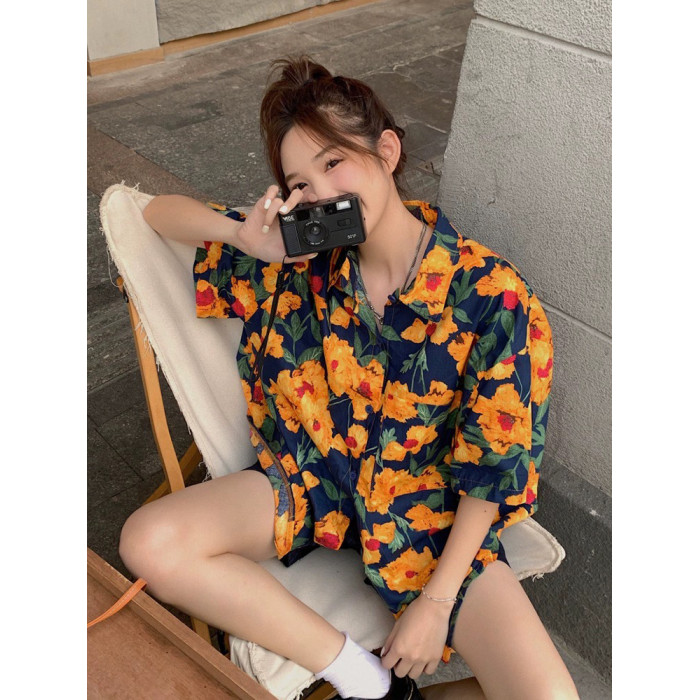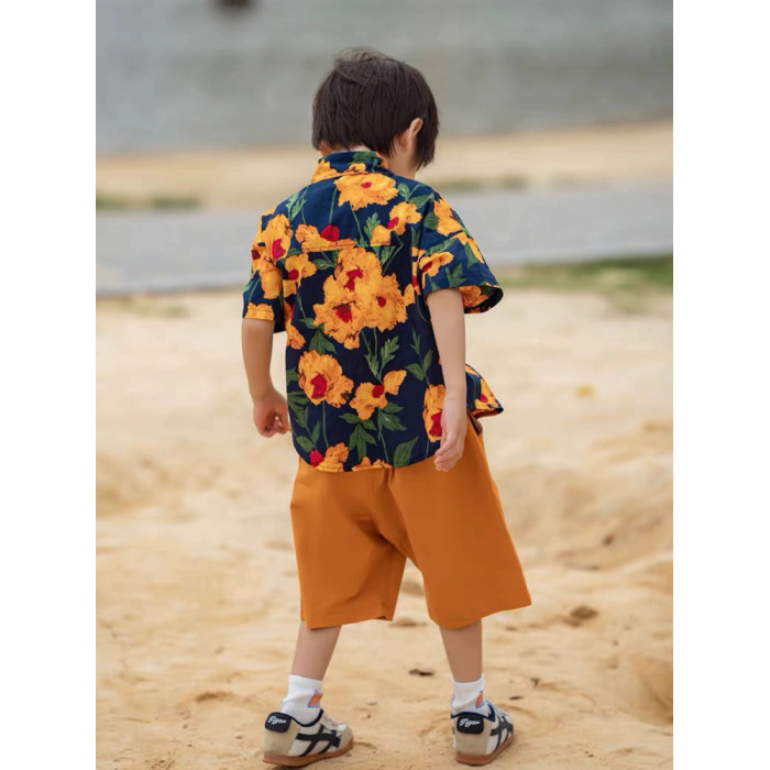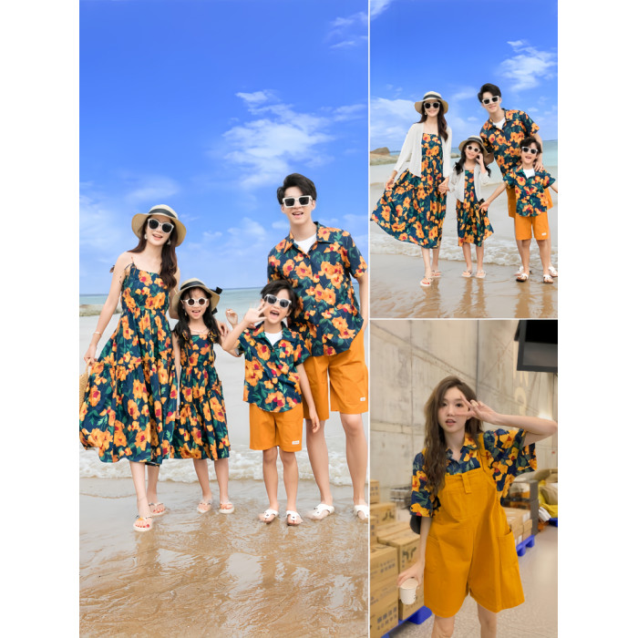 復古港風親子裝一家三口四口夏季花襯衫海邊度假沙灘裙母女連衣裙