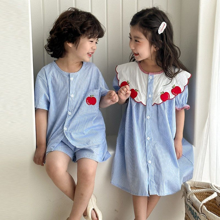 兄妹裝兒童夏季純棉開衫姐弟裝圓領襯衫親子裝兩件套韓版短袖套裝