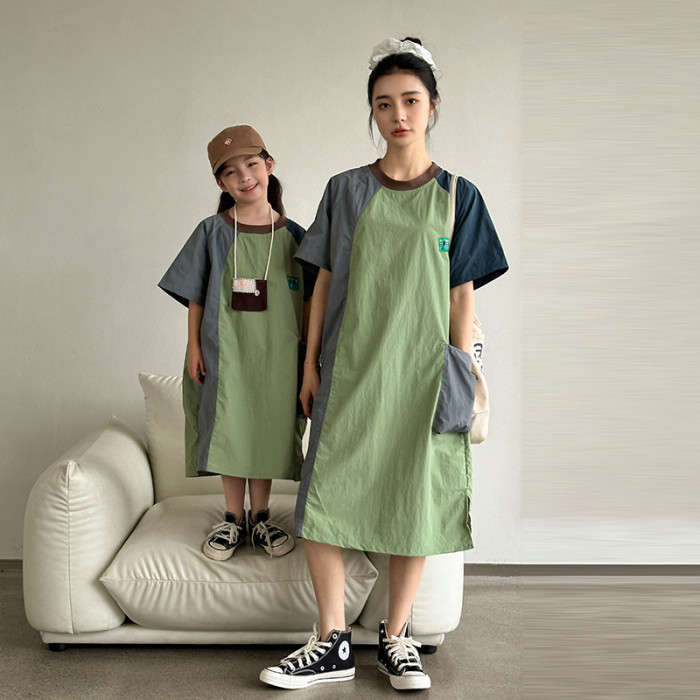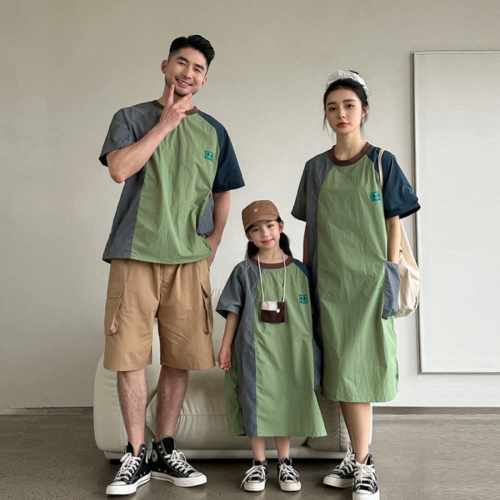 親子裝短袖2025夏季韓版一家三四口拼色休閒Tt恤衫出遊母女裝裙子