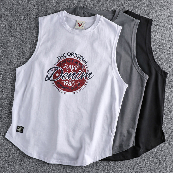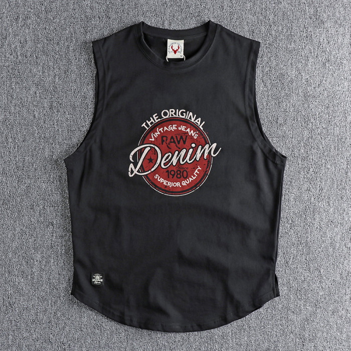 香港潮牌復古做舊字母印花無袖背心男 全棉寬松汗衫潮流青年運動T