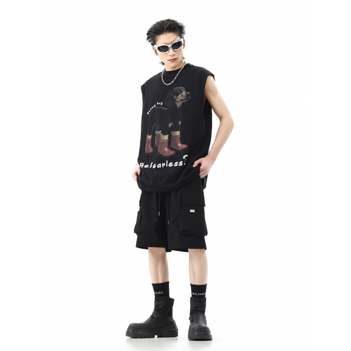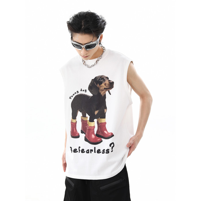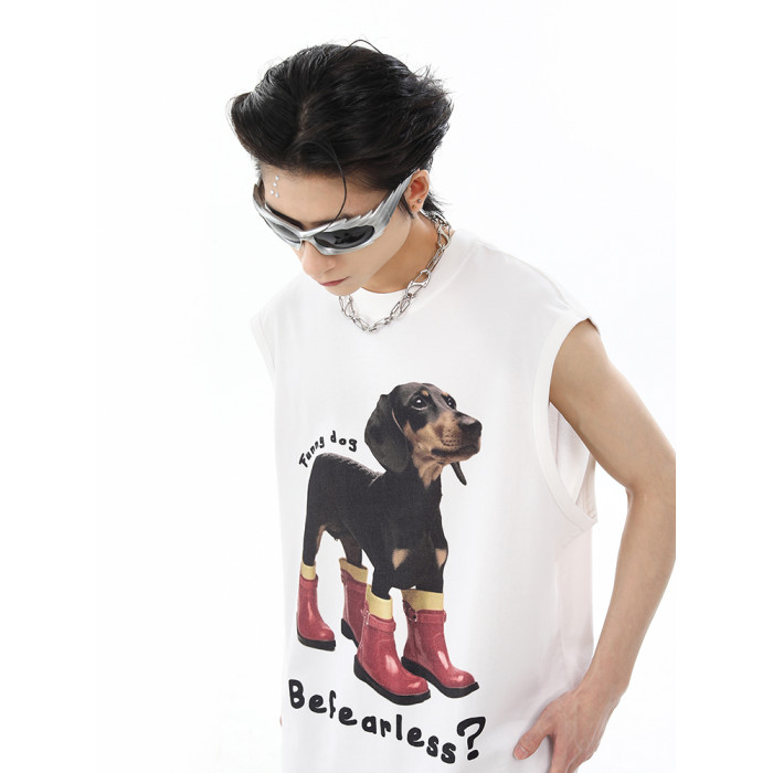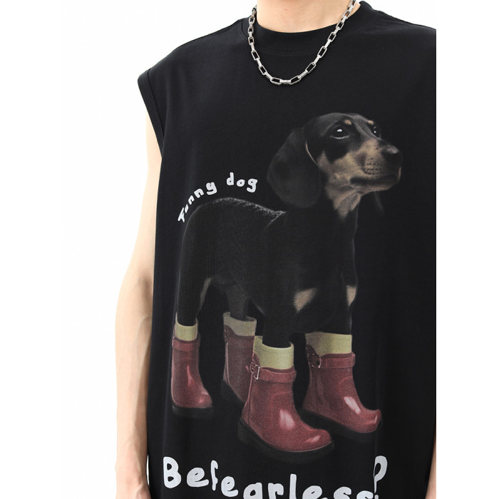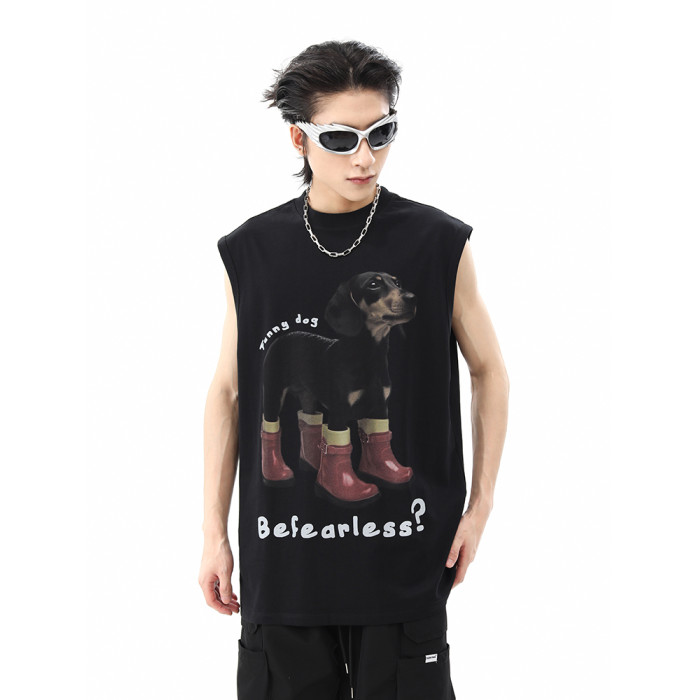 歐美潮牌小狗印花寬肩小圓領無袖t恤男生夏季小領口寬松坎肩背心