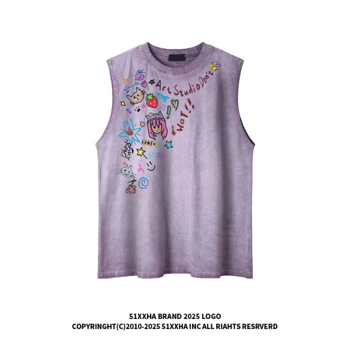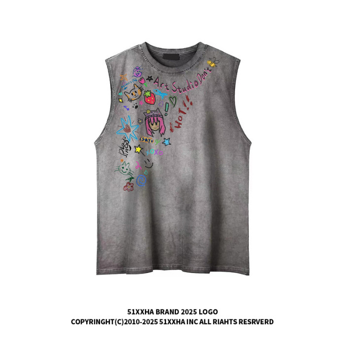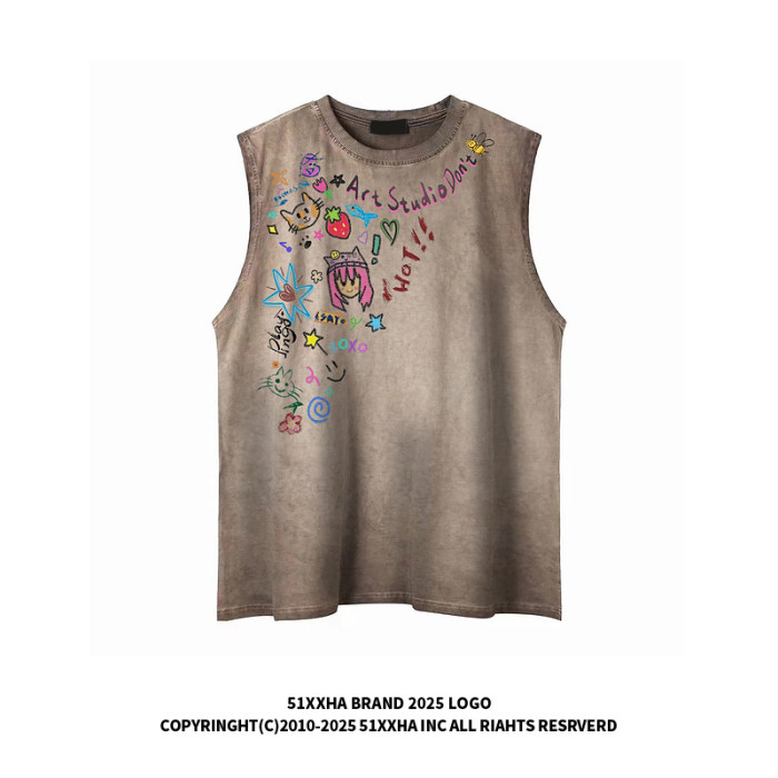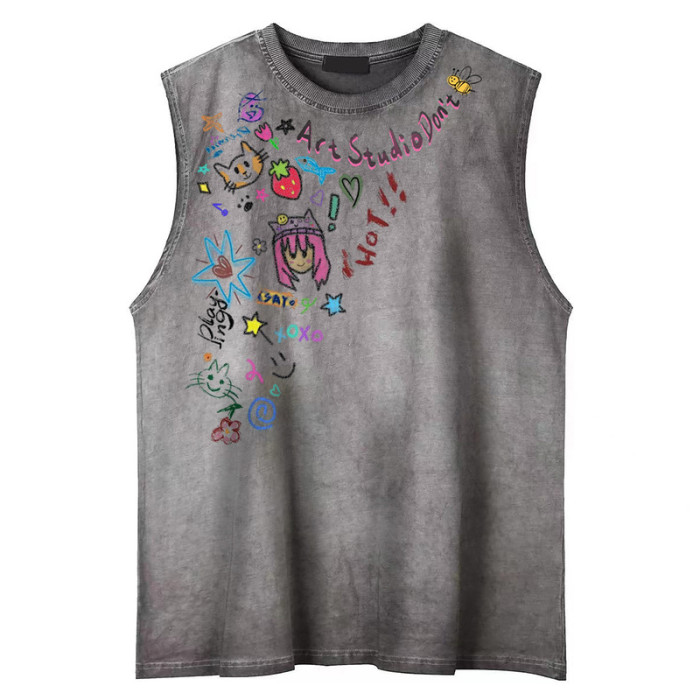 51嘻哈美式趣味卡通印花無袖T恤男dirtyfit髒洗做舊寬松坎肩背心