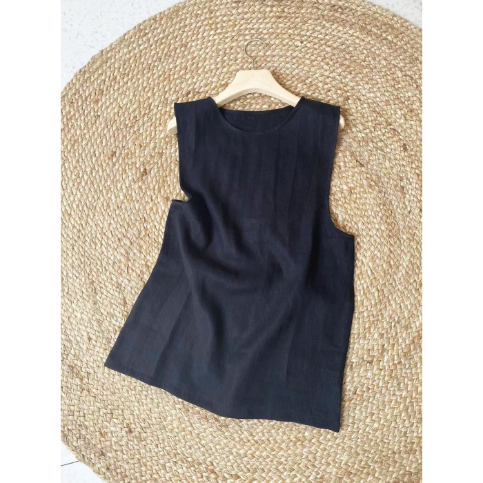 法國純亞麻涼爽男士無袖背心T恤 黑色休閒上衣汗背心