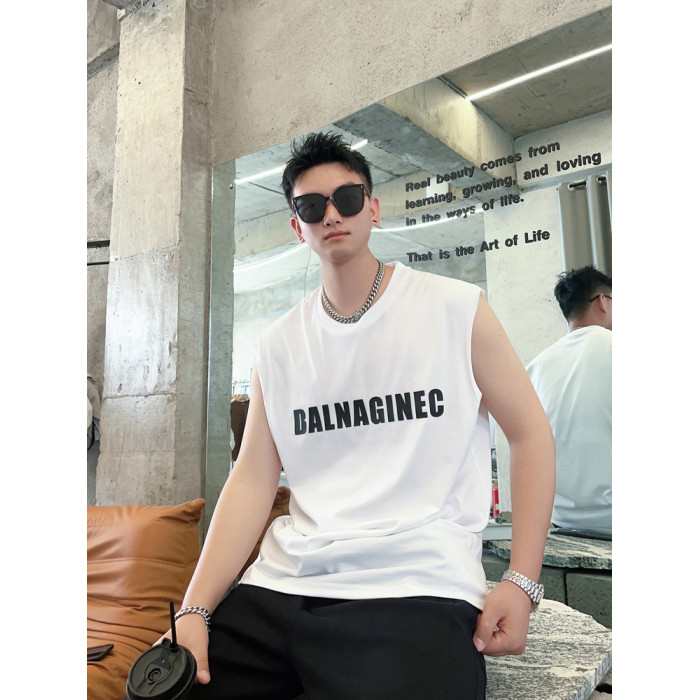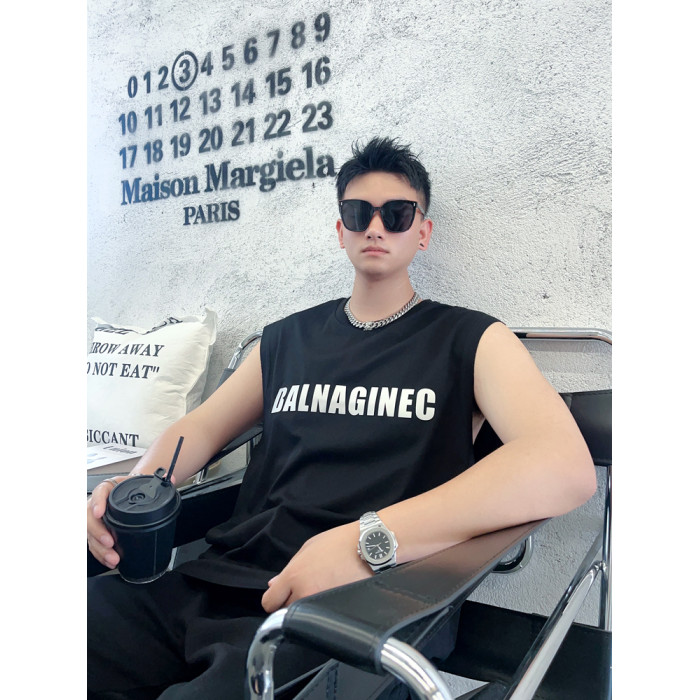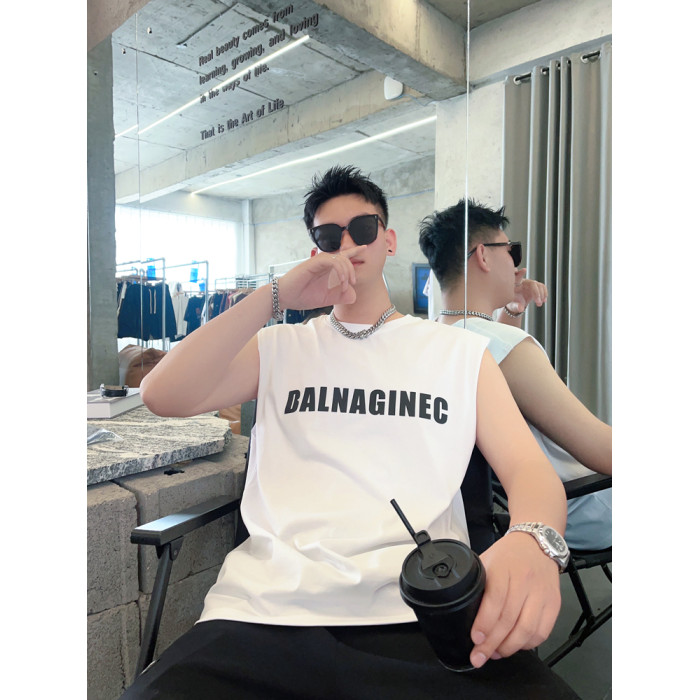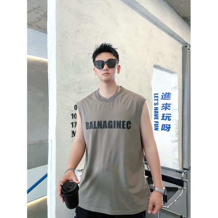 夏季新款無袖T恤男士流行圓領字母印花寬松夏裝背心青年休閒砍袖