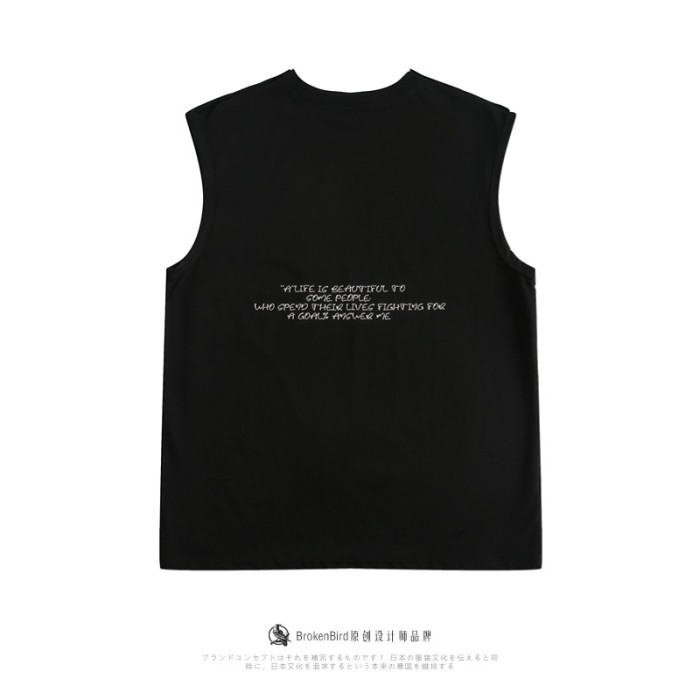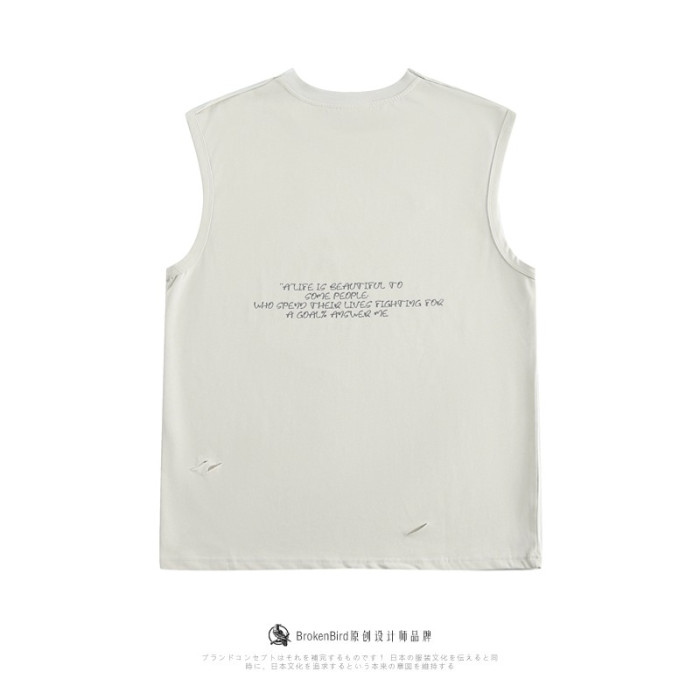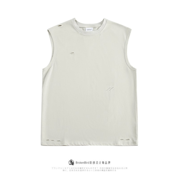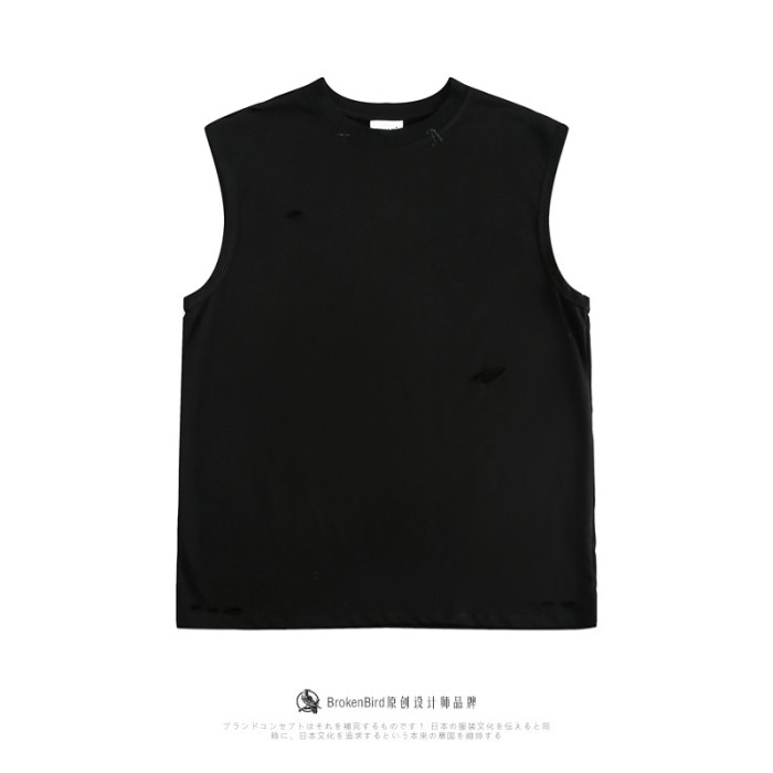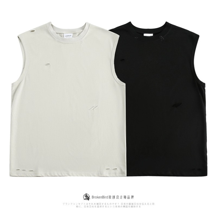 日系簡約極簡風破洞背心t恤男夏季薄款街頭上衣坎肩打底衫潮牌tee