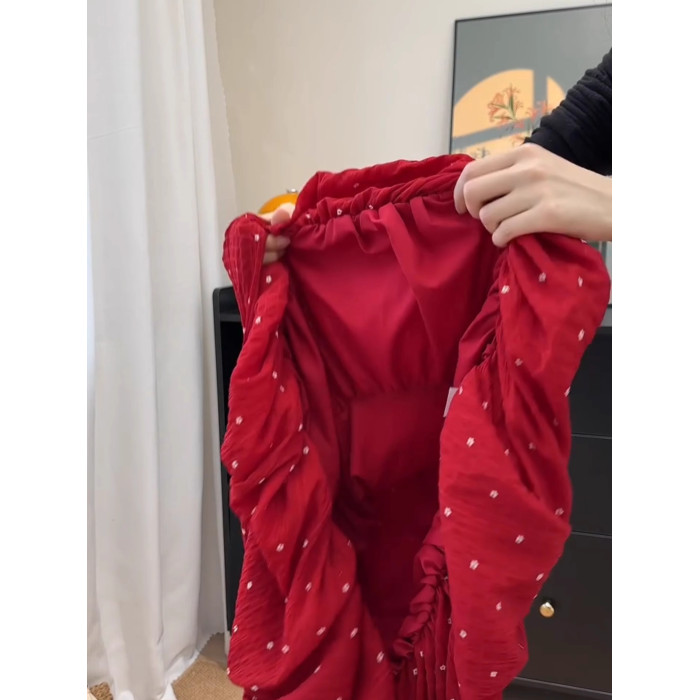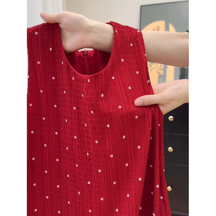 一慄莎子~法式紅色無袖背心波點連衣裙子女夏季新款氣質花苞短裙