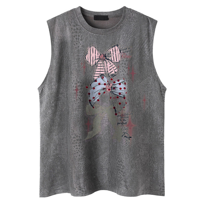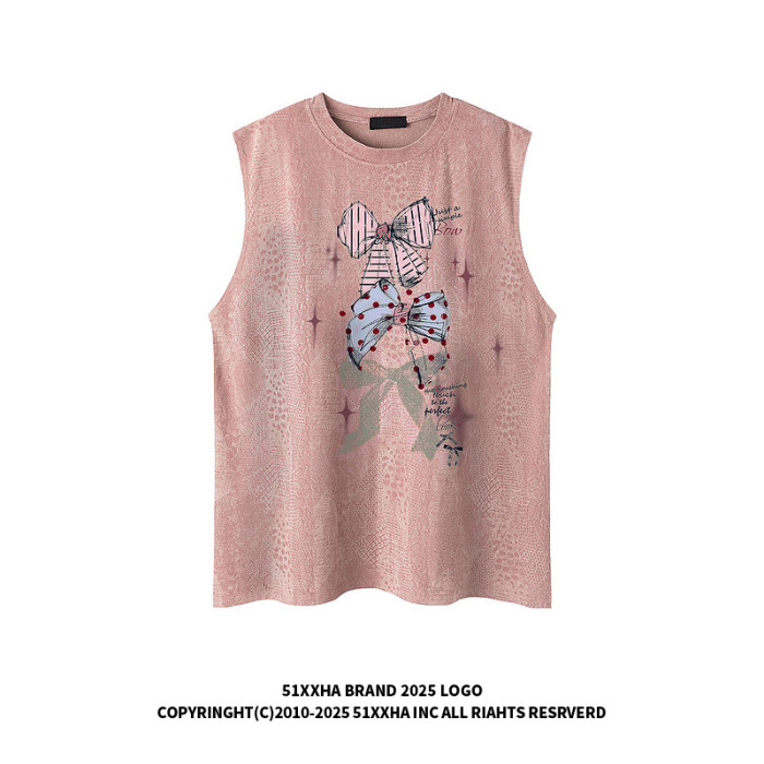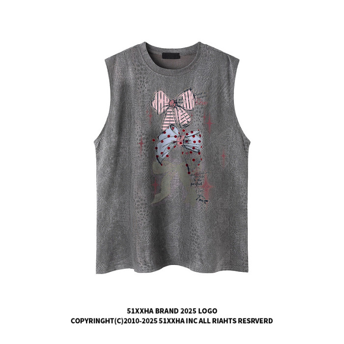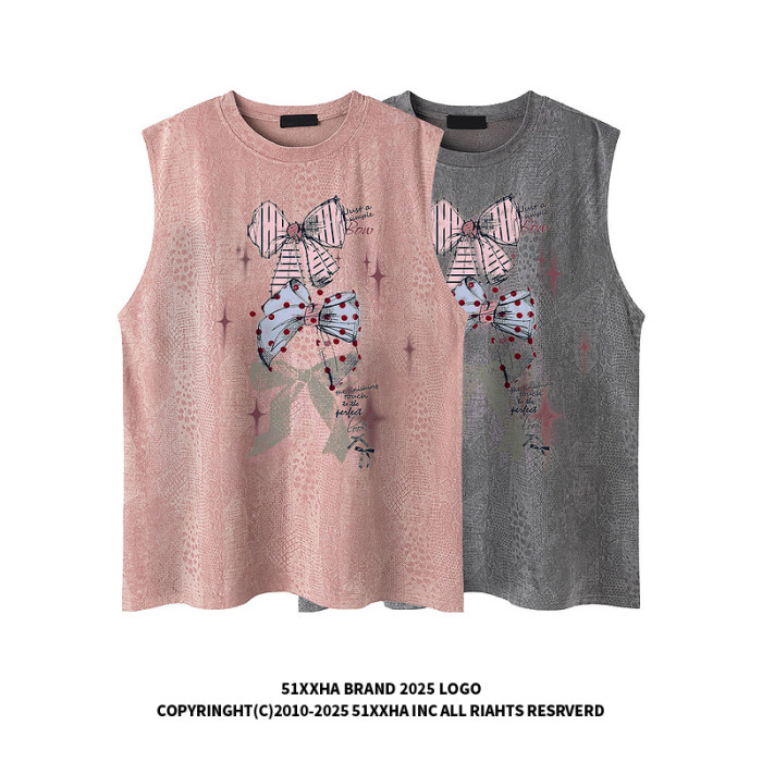 51嘻哈美式復古蝴蝶結印花無袖T恤男女夏季寬松休閒健身坎肩背心