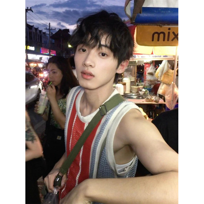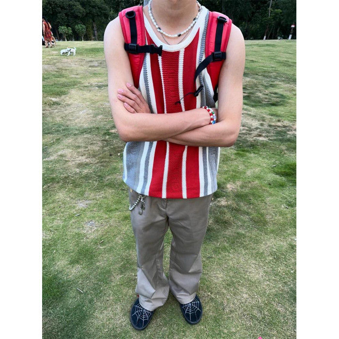 美式圓領拼色竪條修身針織背心男士2025新款休閒彈力無袖坎肩T恤