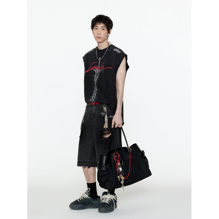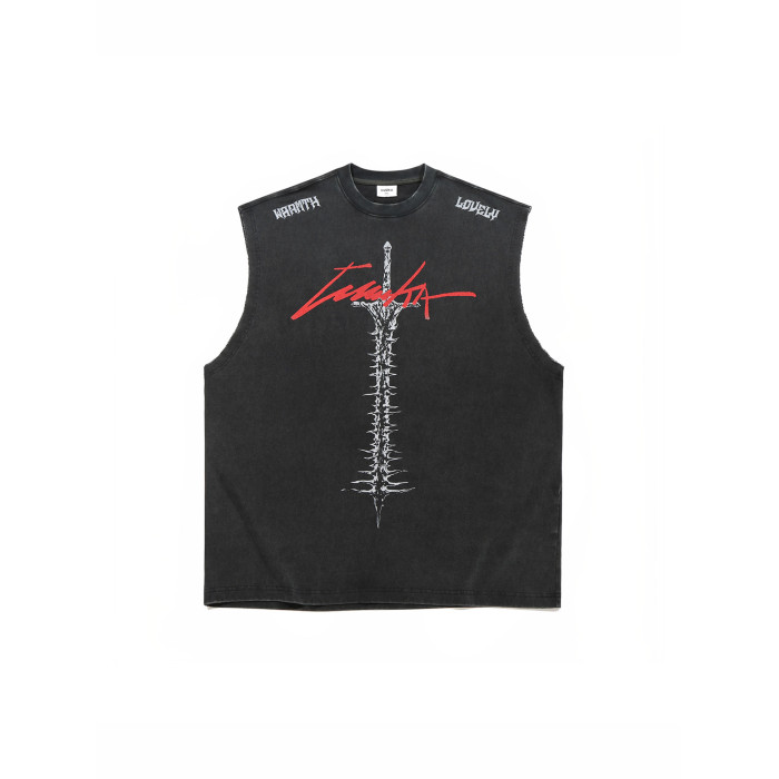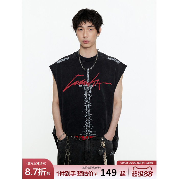 張皓倫同款GUUKA潮牌黑色美式坎肩背心男重磅純棉復古水洗無袖T恤
