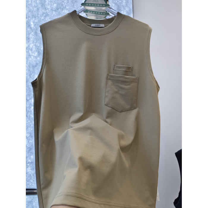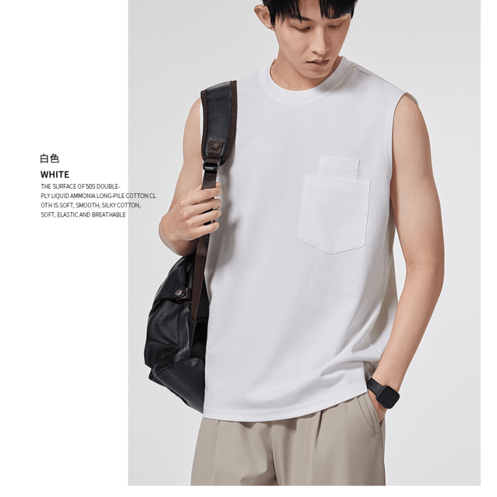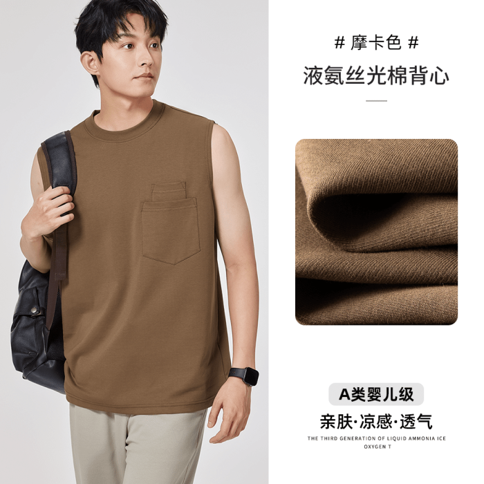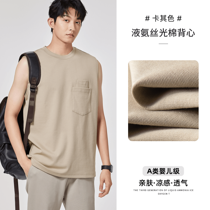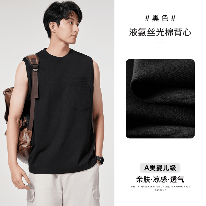 冰絲液氨涼感絲光棉無袖T恤背心男士夏運動健身口袋汗衫大碼寬松