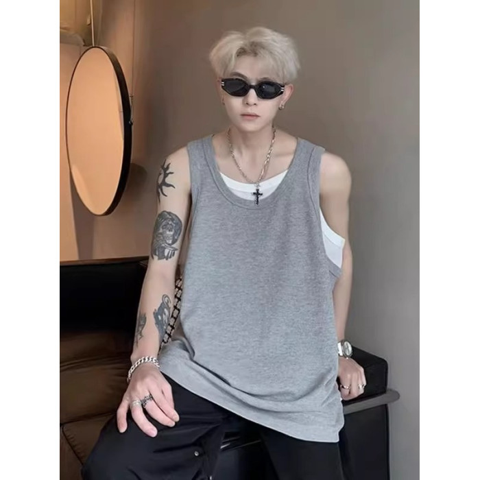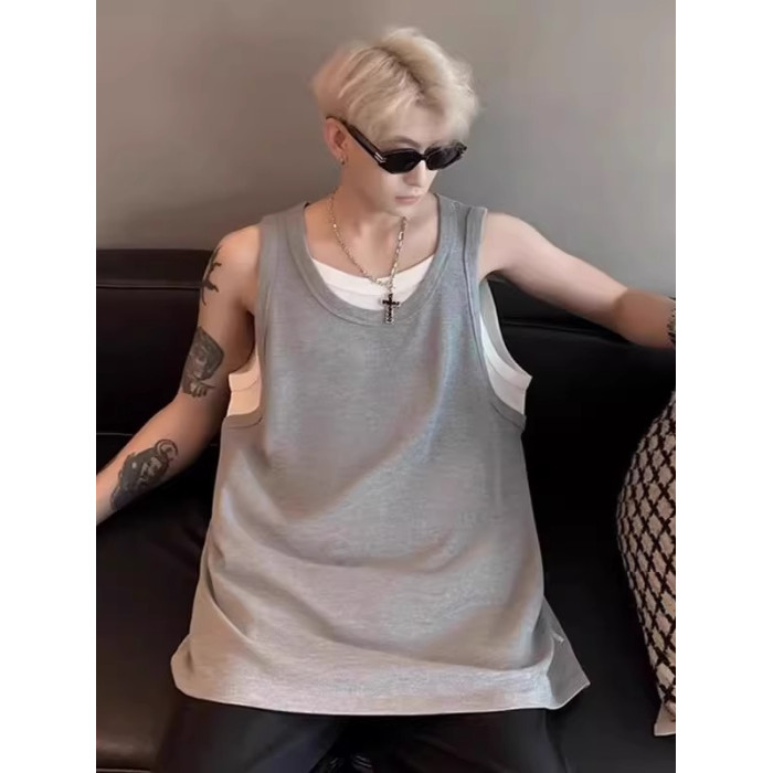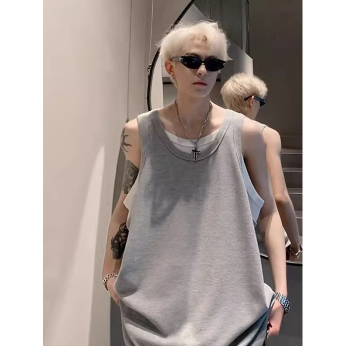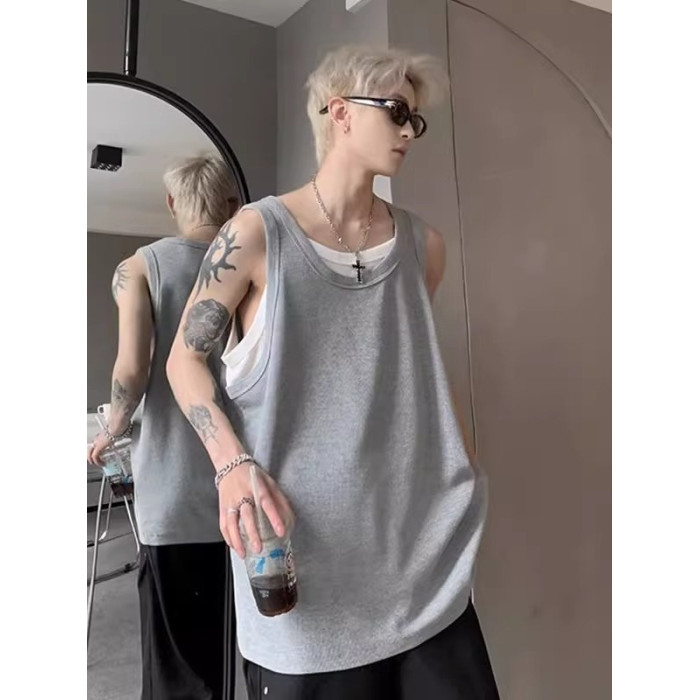 特大碼300斤美式復古無袖背心T恤男女夏季設計感休閒曡穿坎肩上衣