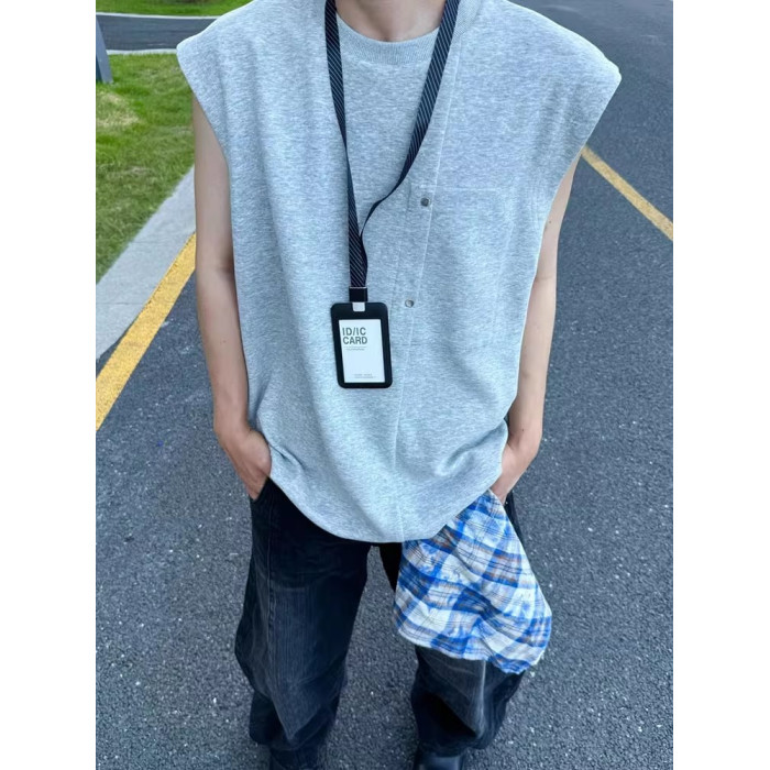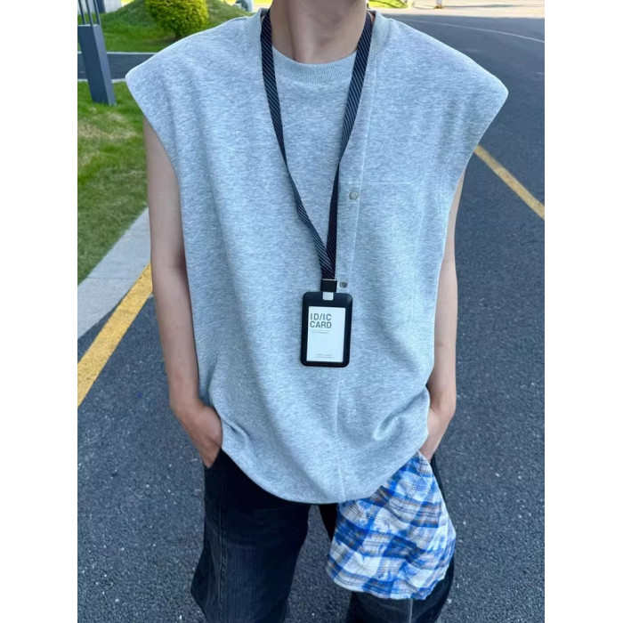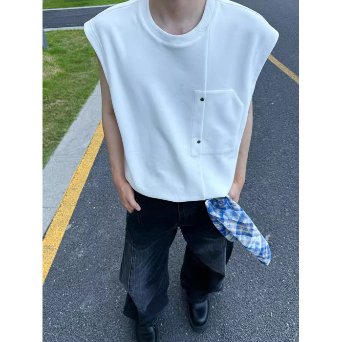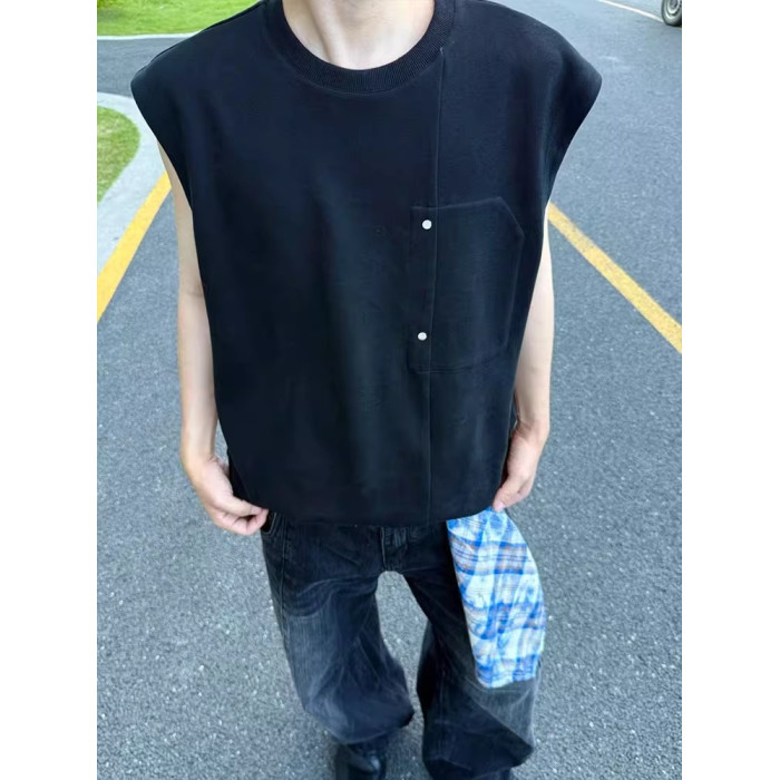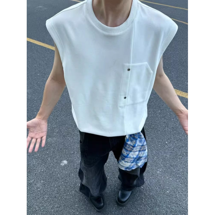 美式口袋鉚釘正肩背心男夏季解搆拼接設計感無袖T恤運動坎肩汗衫