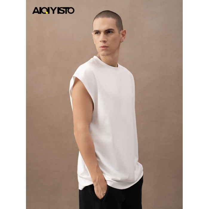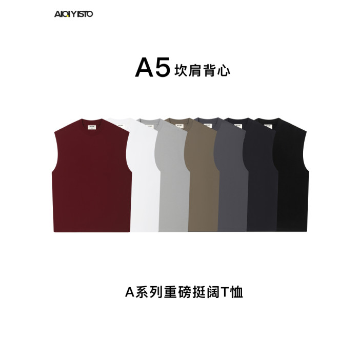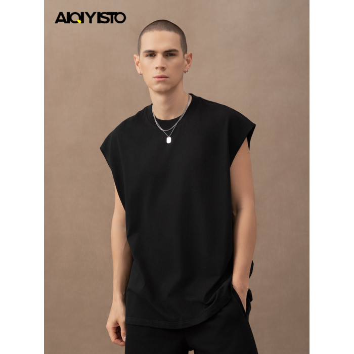 坎肩無袖小領口T恤男美式運動健身寬松310g重磅寬肩純色全棉背心