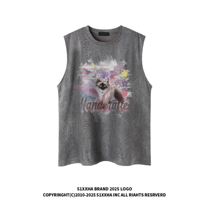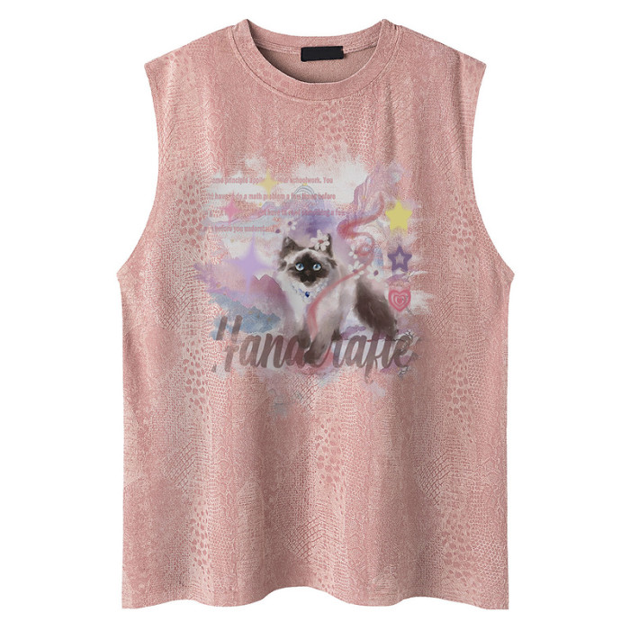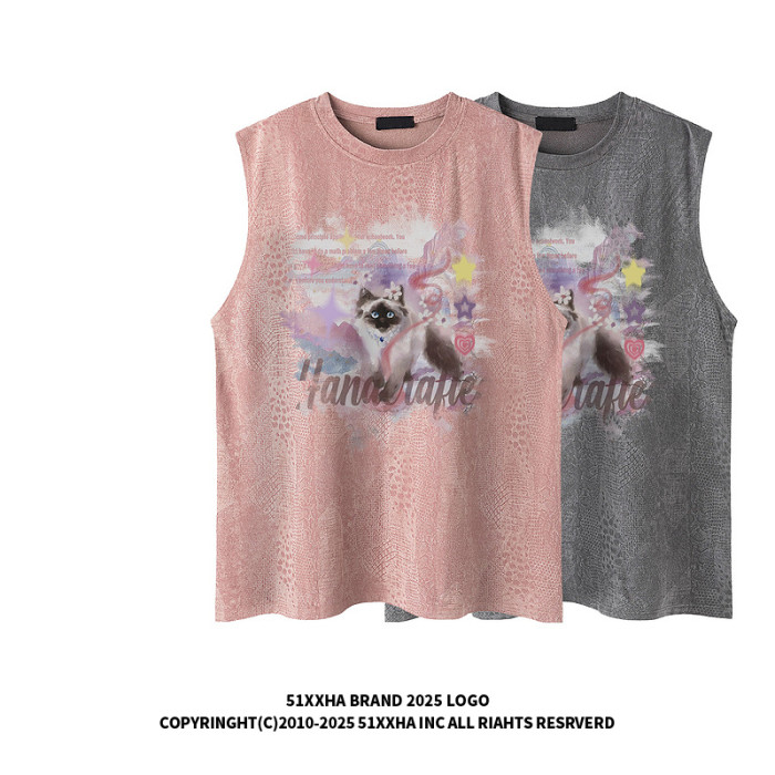 51嘻哈復古vintage小貓印花坎肩背心男女夏季寬松休閒情侶無袖T恤