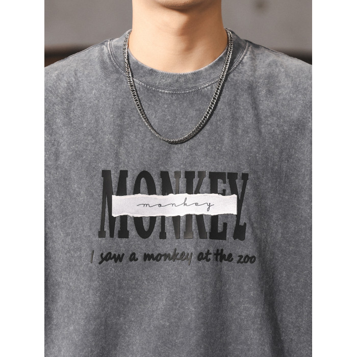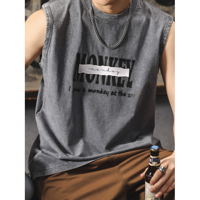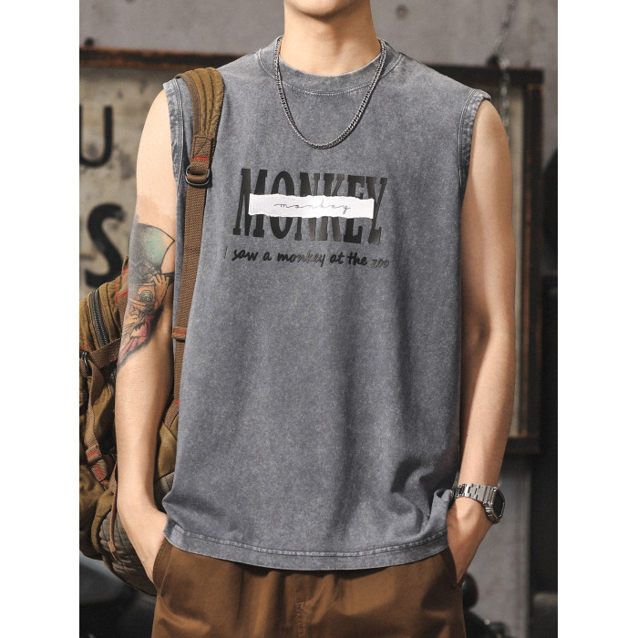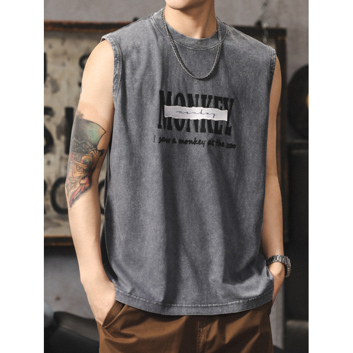 美式復古印花背心男2025新款圓領純棉t恤無袖坎肩大碼運動上衣服