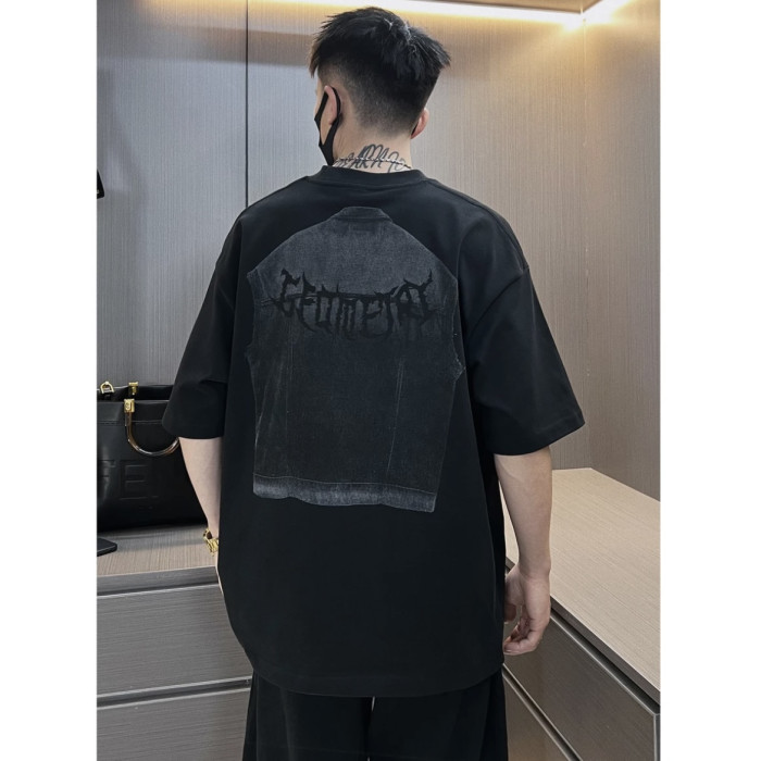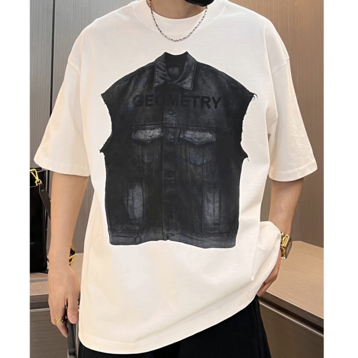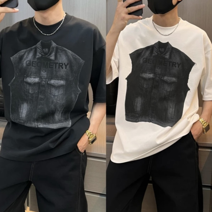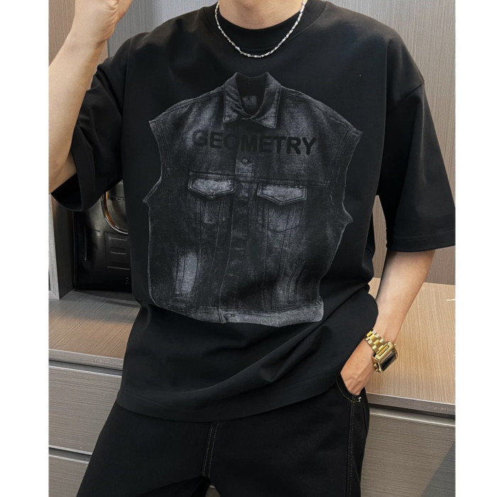 2025夏季新款美式重磅潮牌立體牛仔馬甲印花短袖T恤男痞帥半袖潮