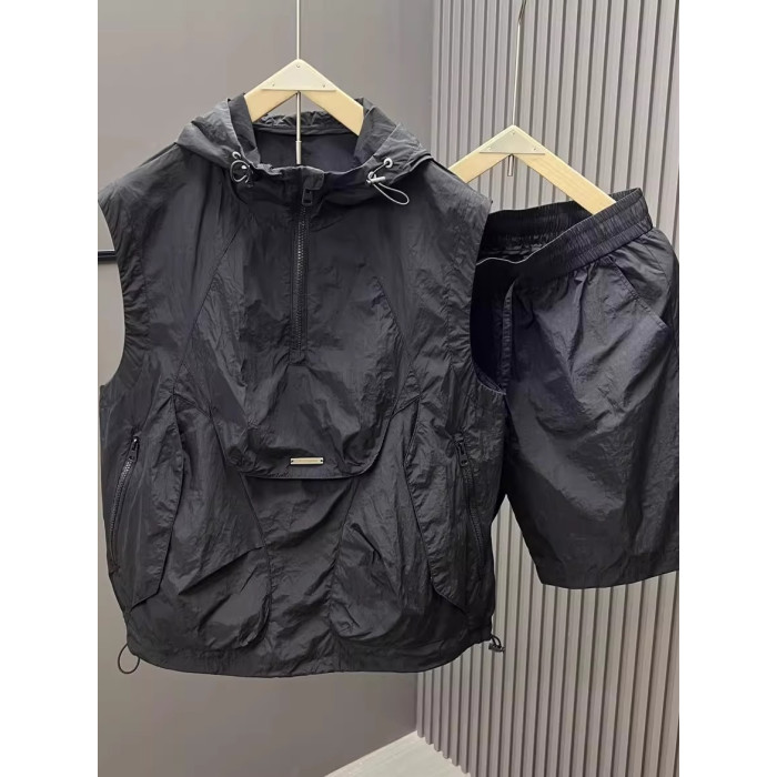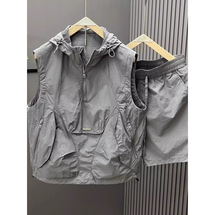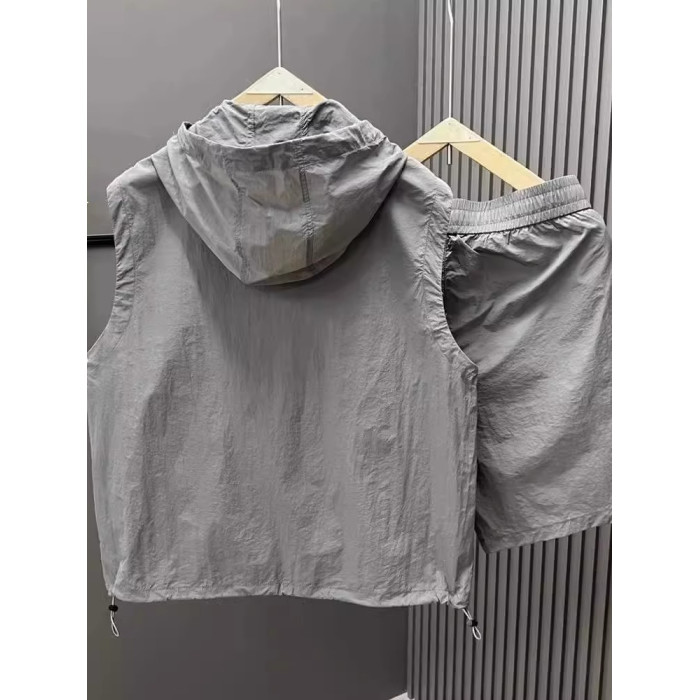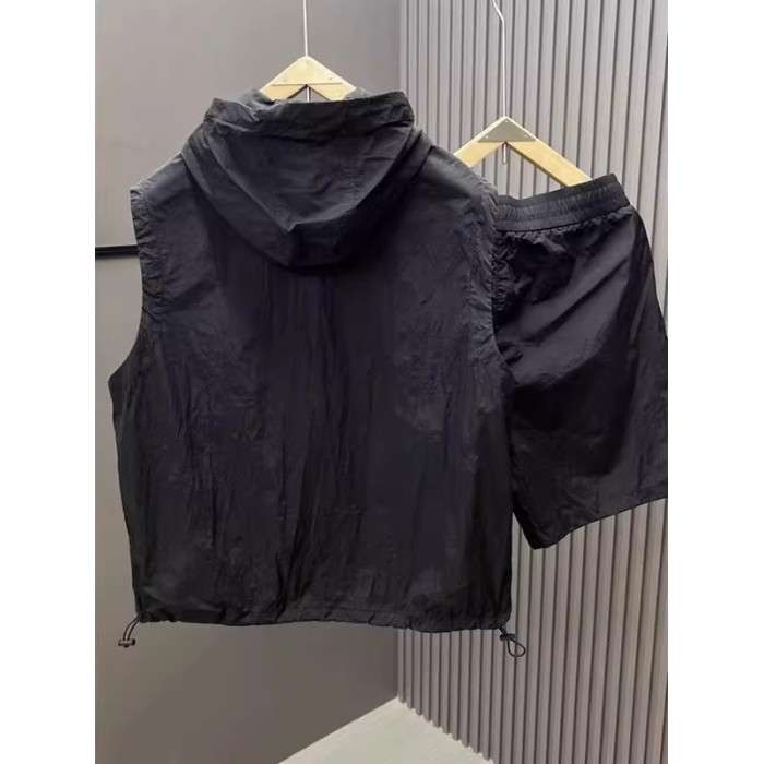 特大碼300斤無袖連帽馬甲短褲兩件套男女夏季薄款寬松運動套裝ins
