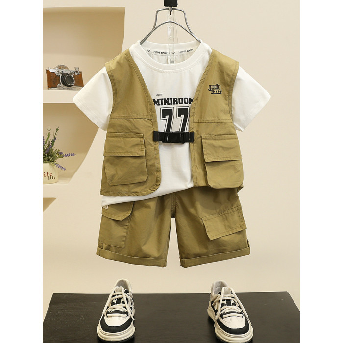 男童夏季短袖套裝洋氣兒童工裝馬甲三件套2025新款時髦寶寶衣服潮