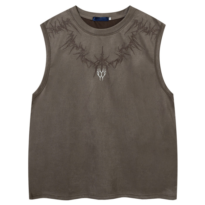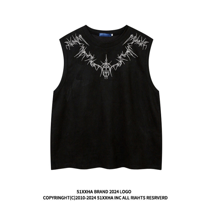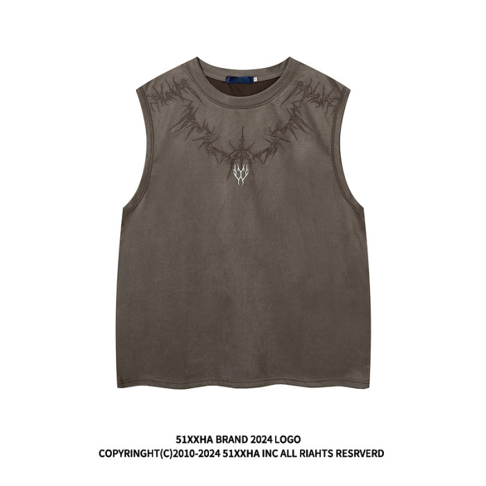 51嘻哈美式高街設計感刺綉坎肩背心男夏季復古寬松麂皮絨無袖T恤
