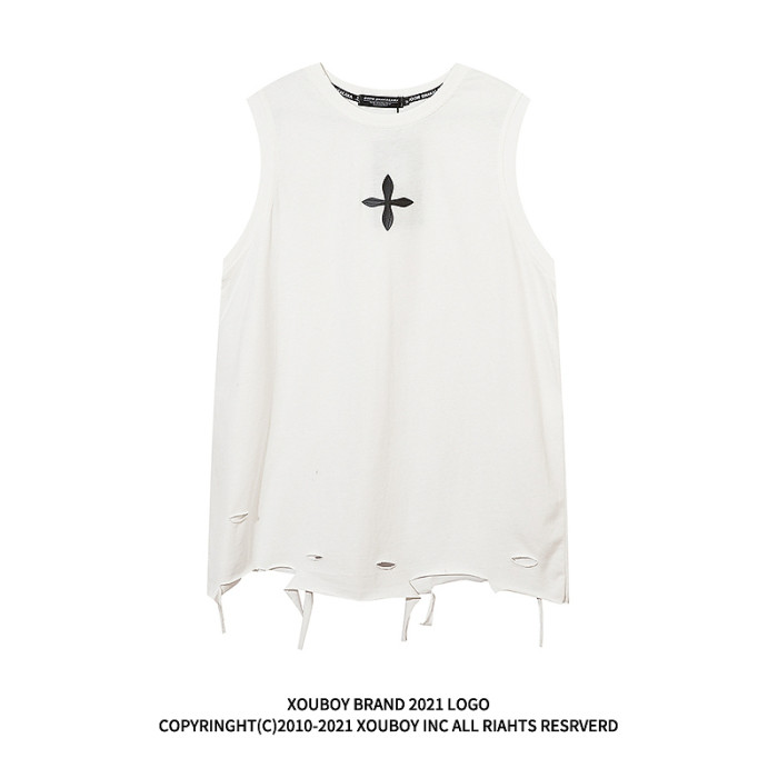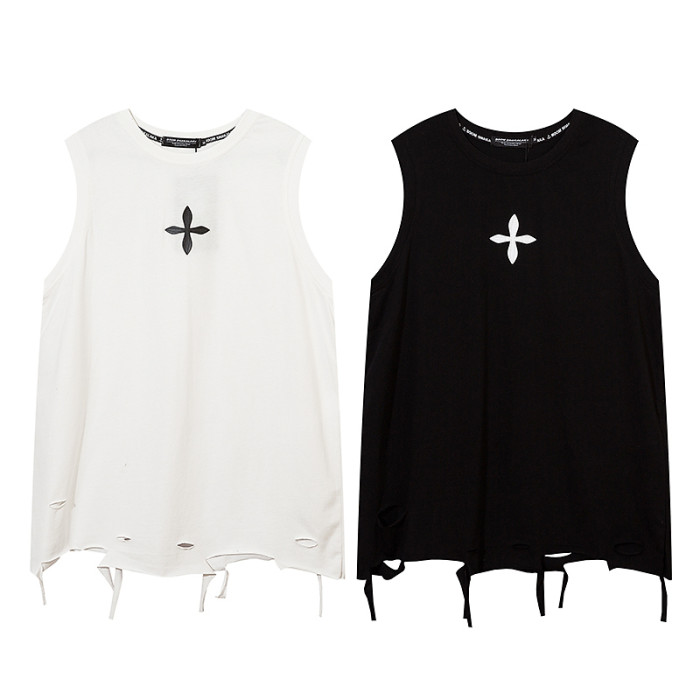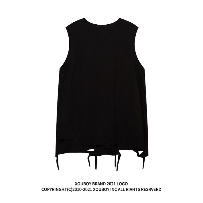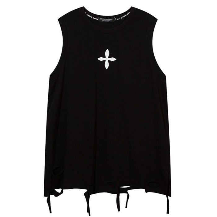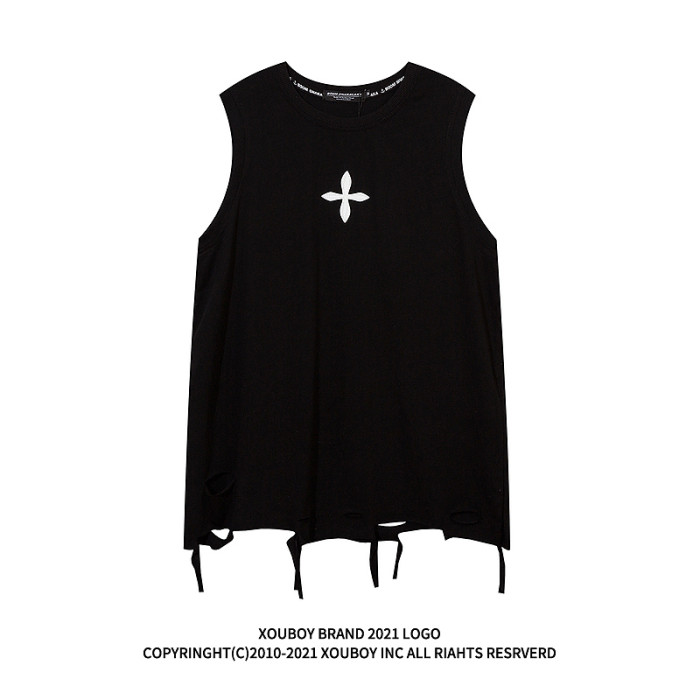夏季潮牌暗黑風純色oversize坎肩背心男潮流嘻哈破洞下擺無袖T恤