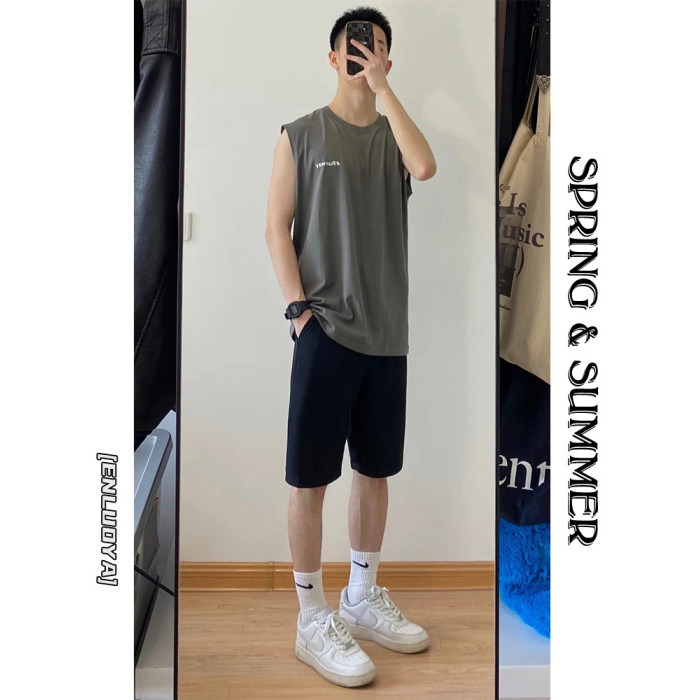 恩洛亞夏季背心男薄款寬松圓領上衣套裝運動汗衫坎肩純棉無袖T恤