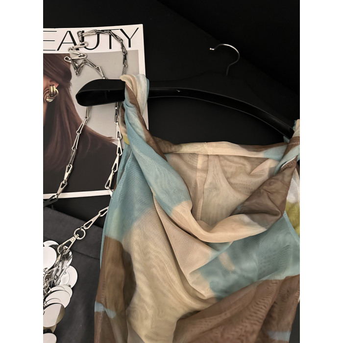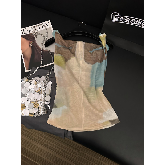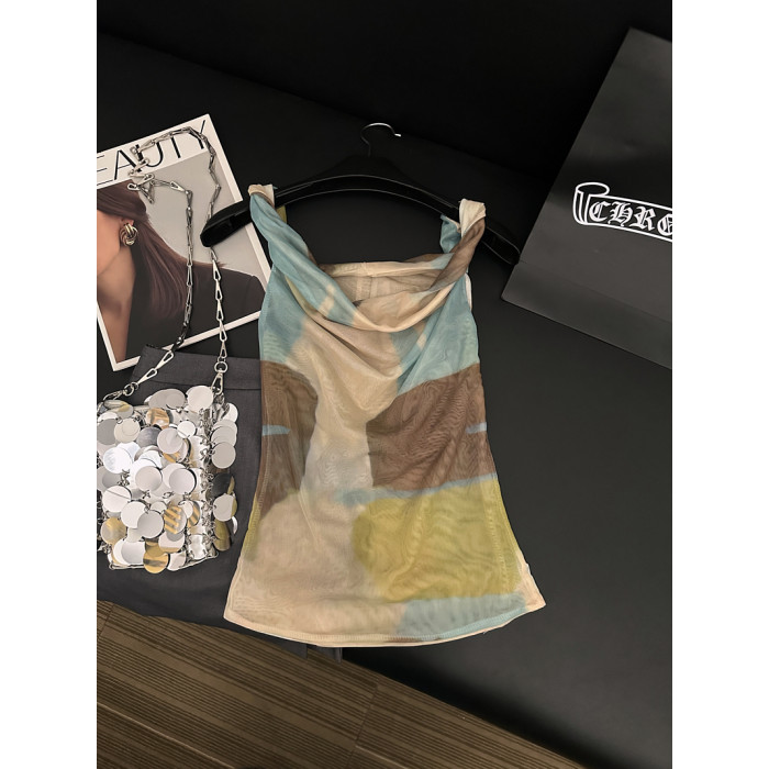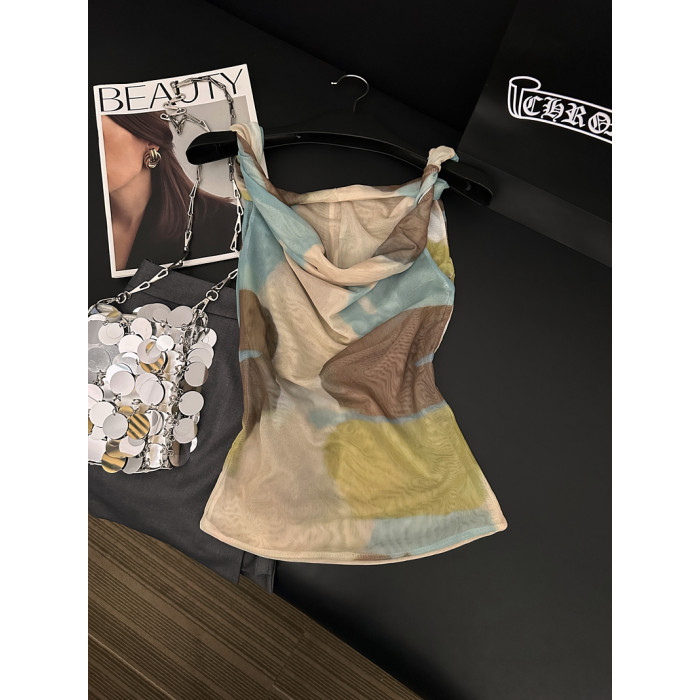 一慄莎子~水墨紥染網紗扭結背心女夏季外穿無袖T恤內搭吊帶小上衣