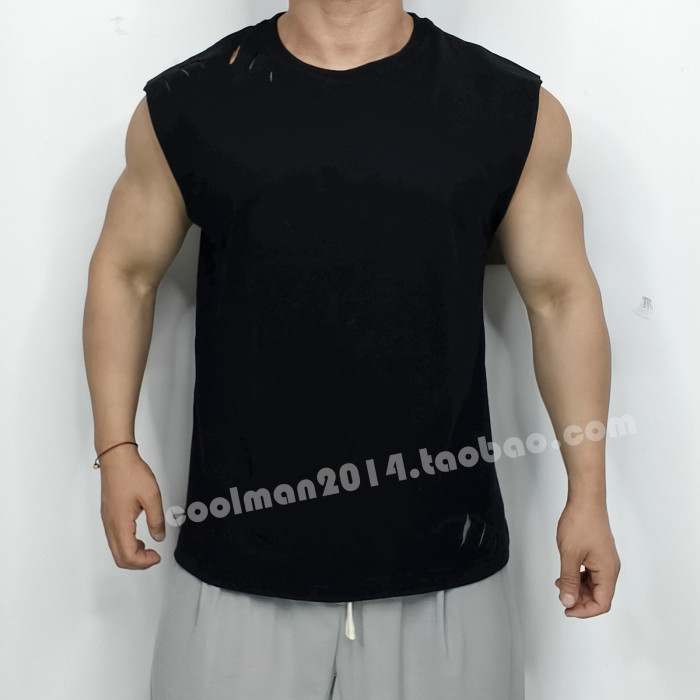 百搭休閒運動寬肩無袖男士磨毛破洞背心T恤美式寬松破爛健身坎肩