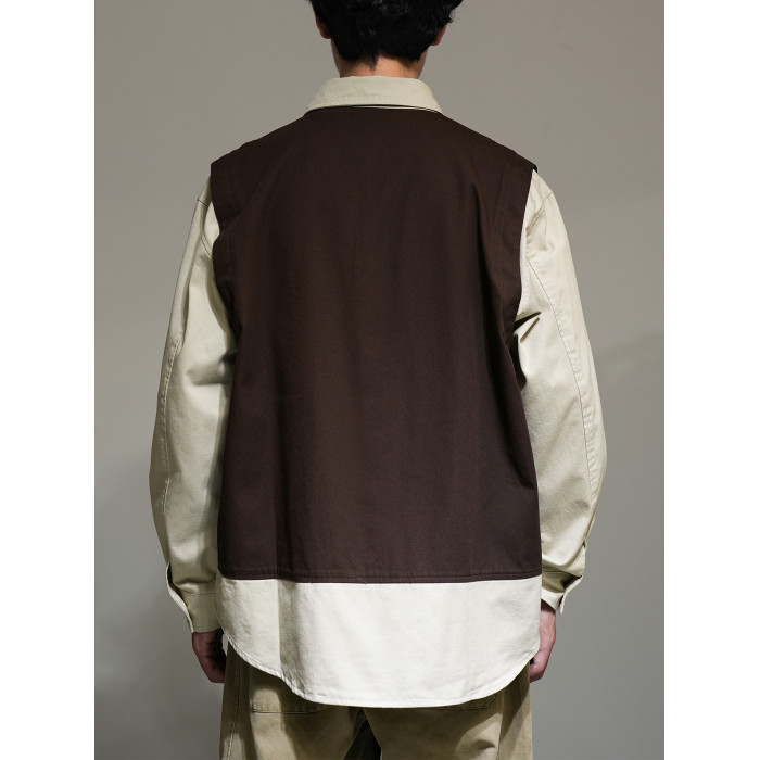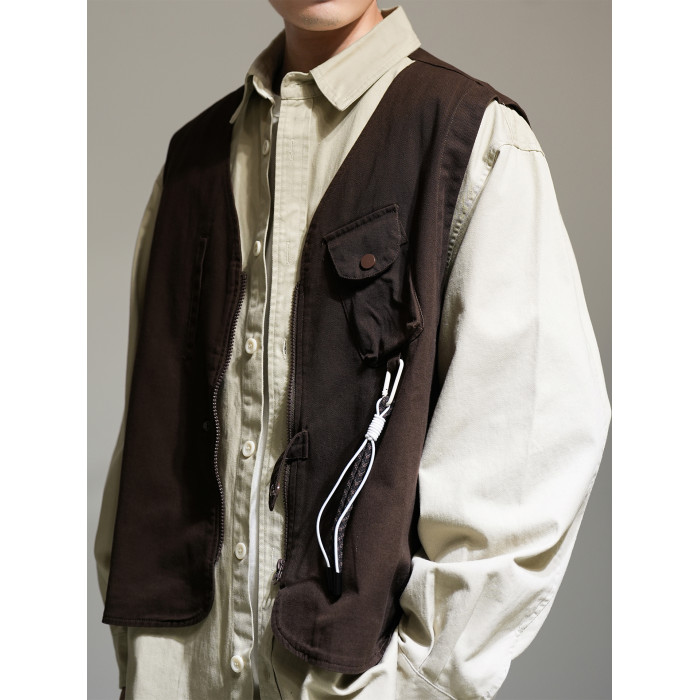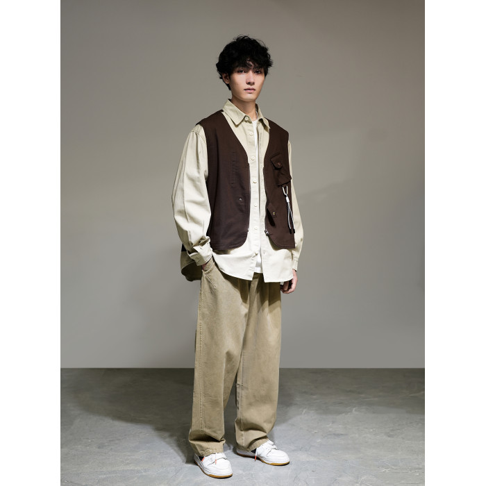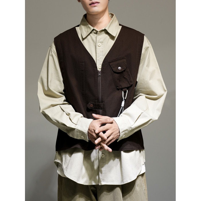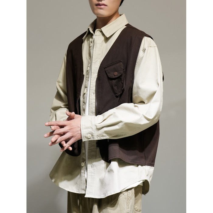 日系潮牌新品機能風假兩件馬甲襯衫男裝秋季重工水洗長袖襯衣外套