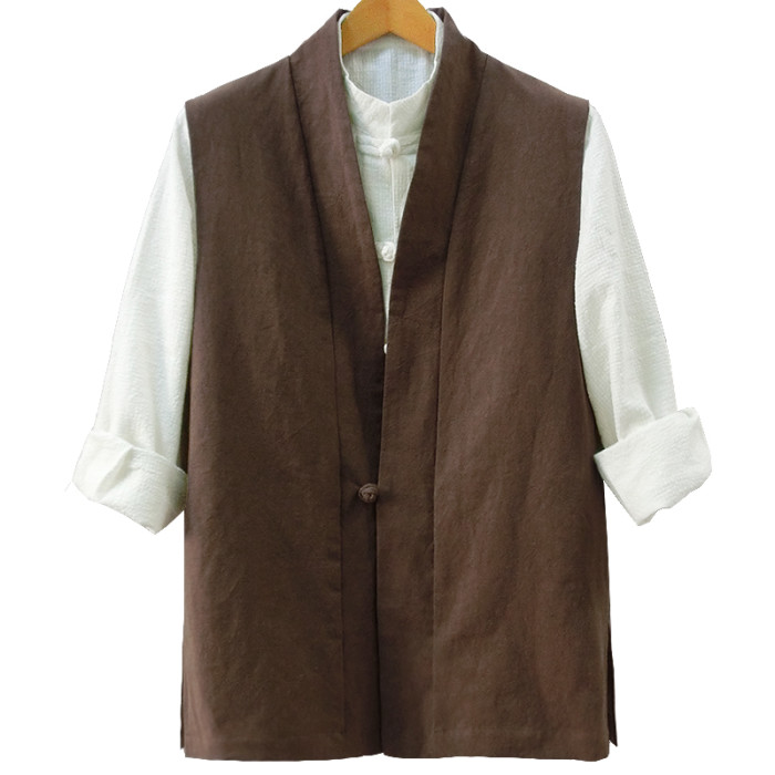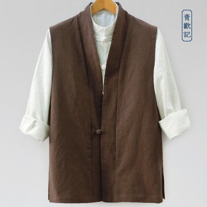 原創春秋季男士休閒亞麻寬松馬甲風盤釦大碼開衫坎肩禪修服男