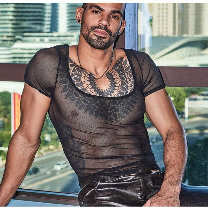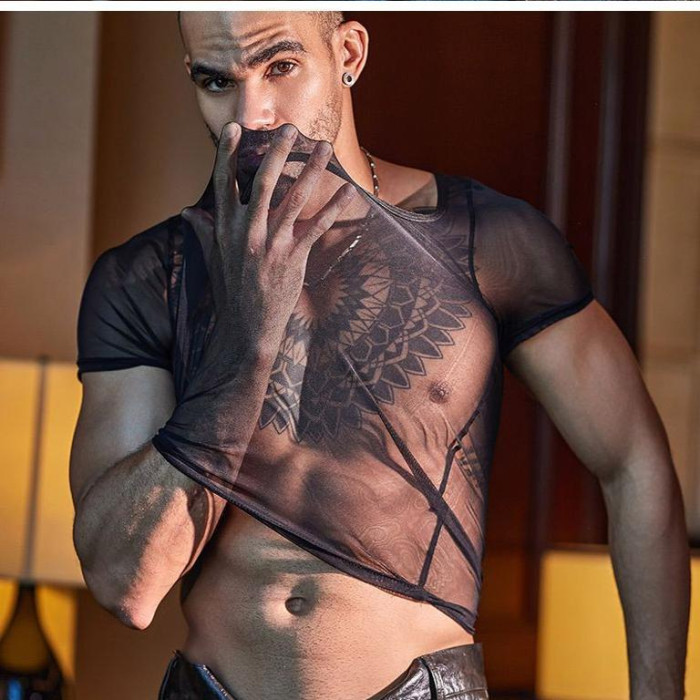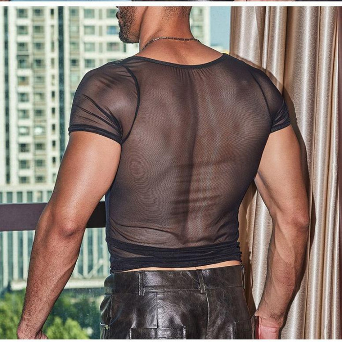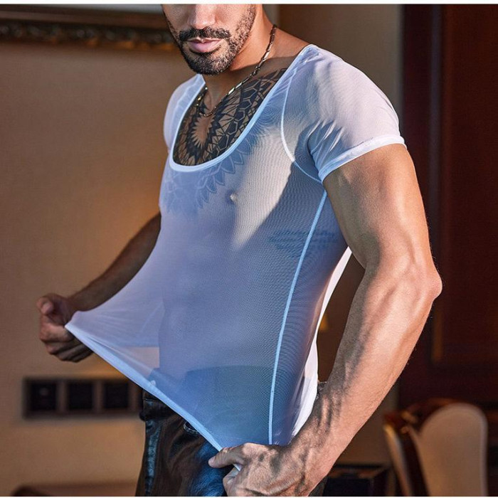 男士T恤薄透明性感透視上衣睡衣背心超高彈體育生塑身肌肉猛男