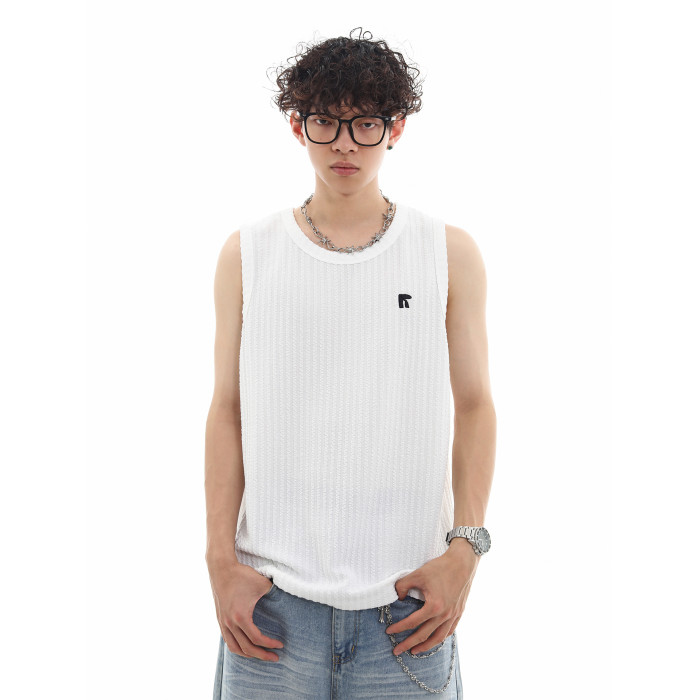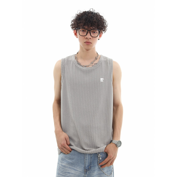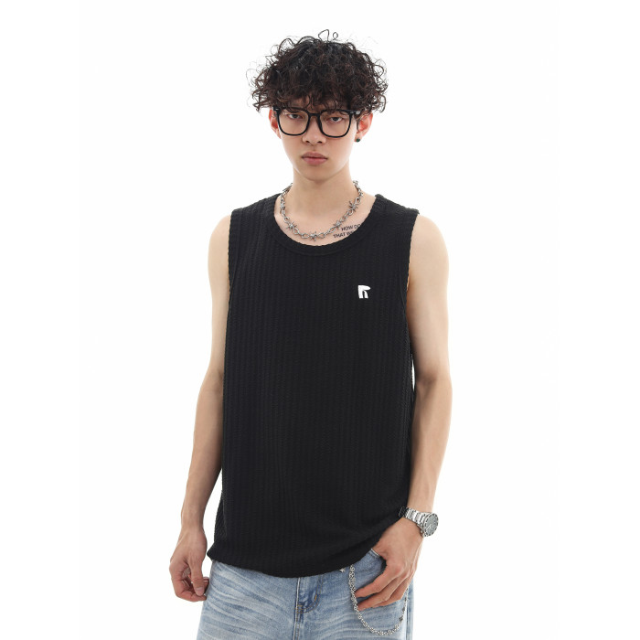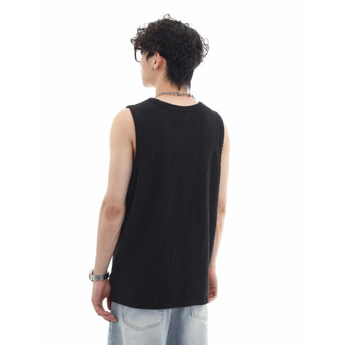 Trend st夏季復古肌理感純色坎肩運動背心男士寬松無袖T恤情侶裝
