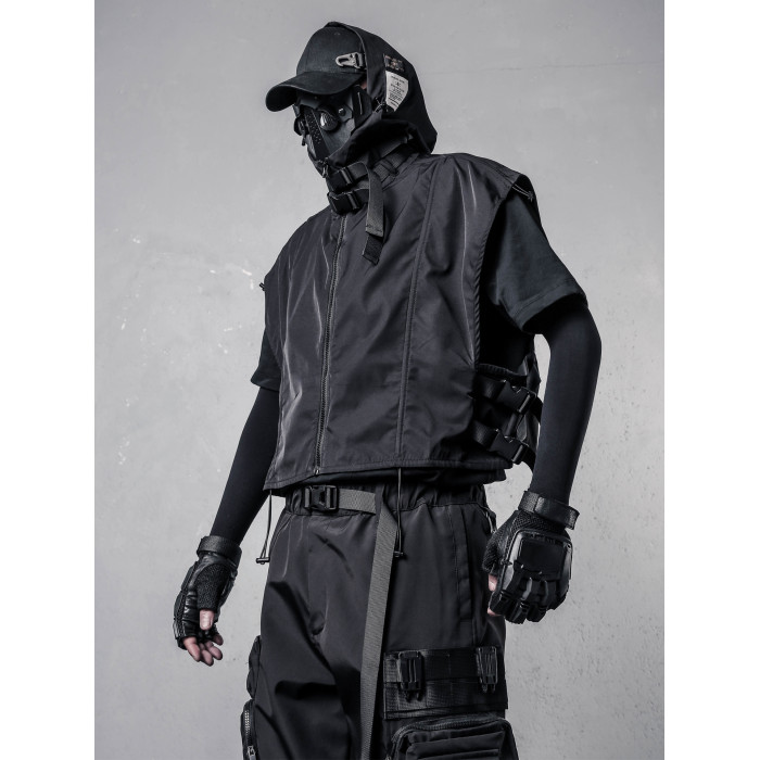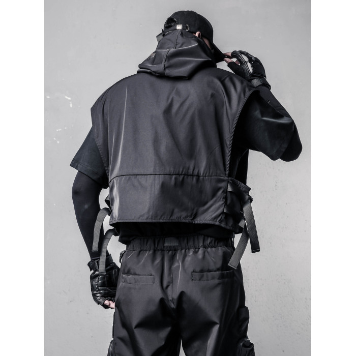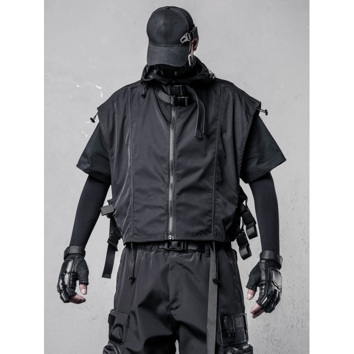 小衆機能硬核戰術馬甲男短款夏季暗黑連帽工裝寬松繖兵飄帶馬夾薄
