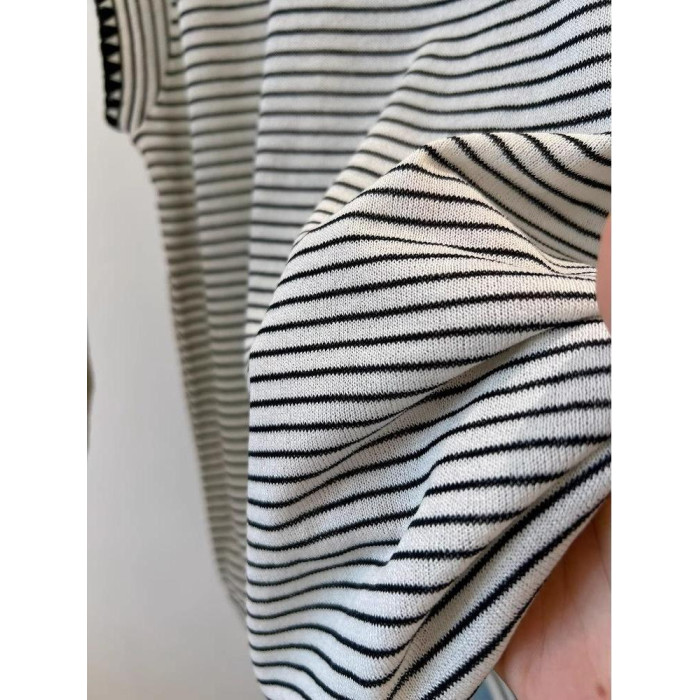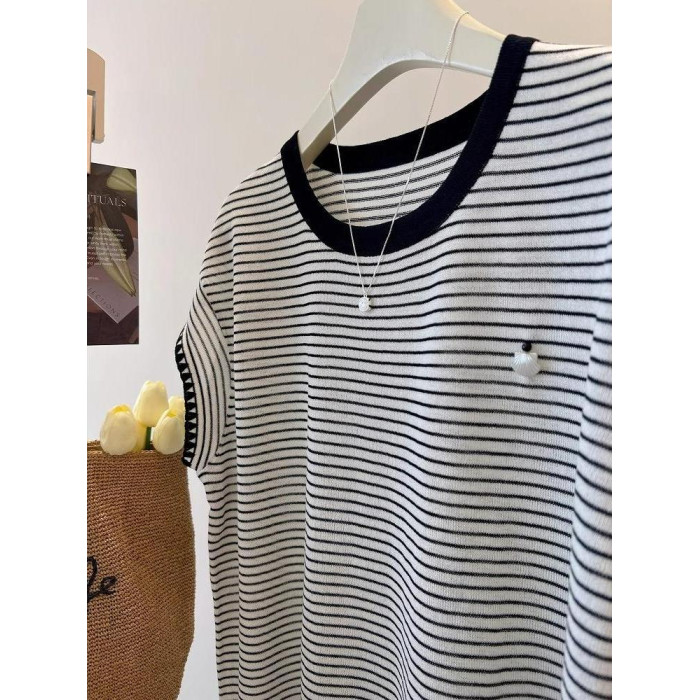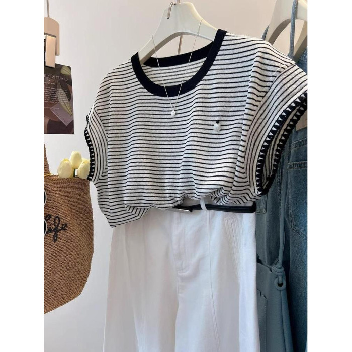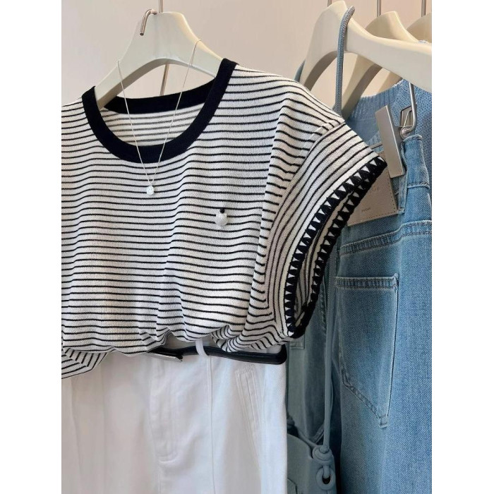 小貝殼裝飾~涼爽透氣顯瘦飛飛袖條紋百搭圓領針織衫女T恤夏