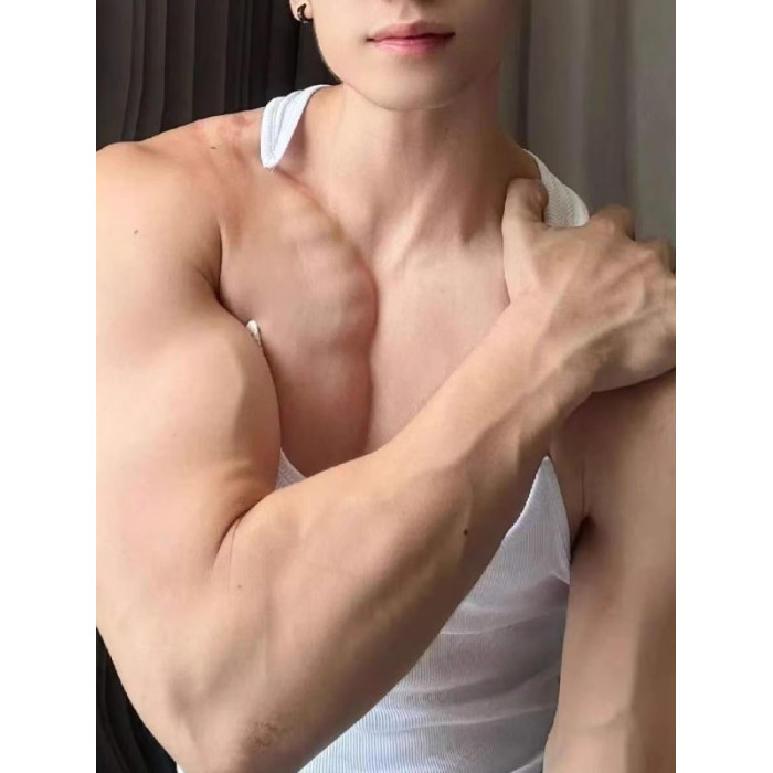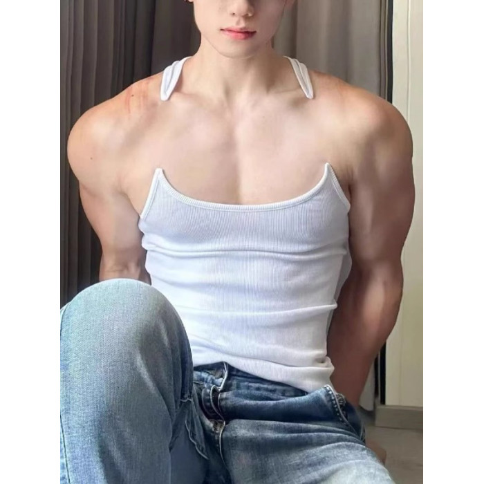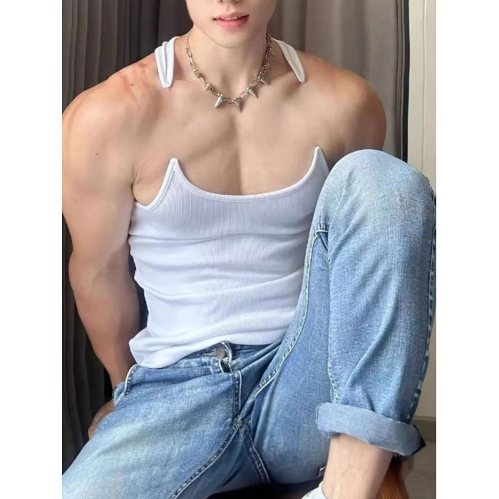 男生雅痞彈力緊身運動背心純欲性感露鎖骨透明肩帶夜店DJ男模上衣