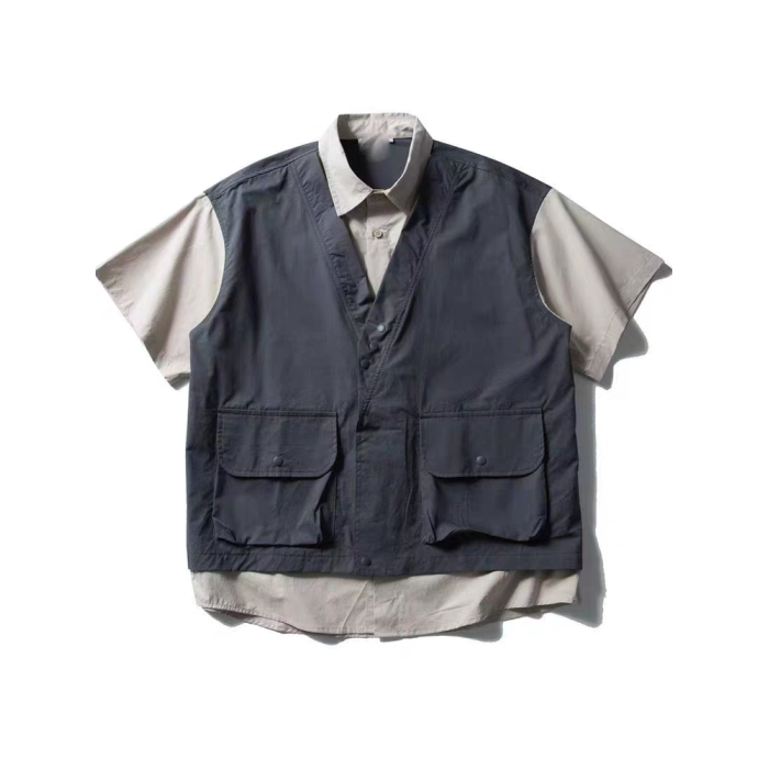 日系cityboy復古撞色假兩件馬甲短袖襯衫男女夏季工裝襯衣潮