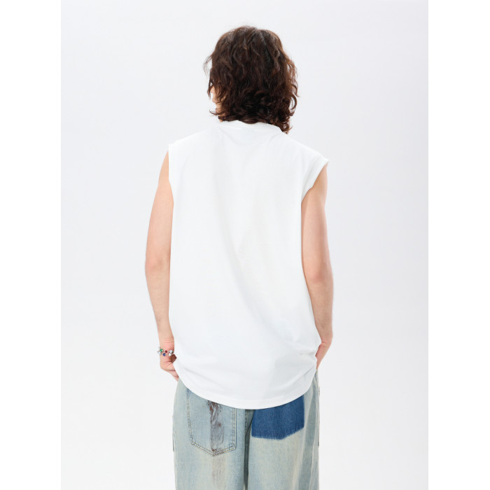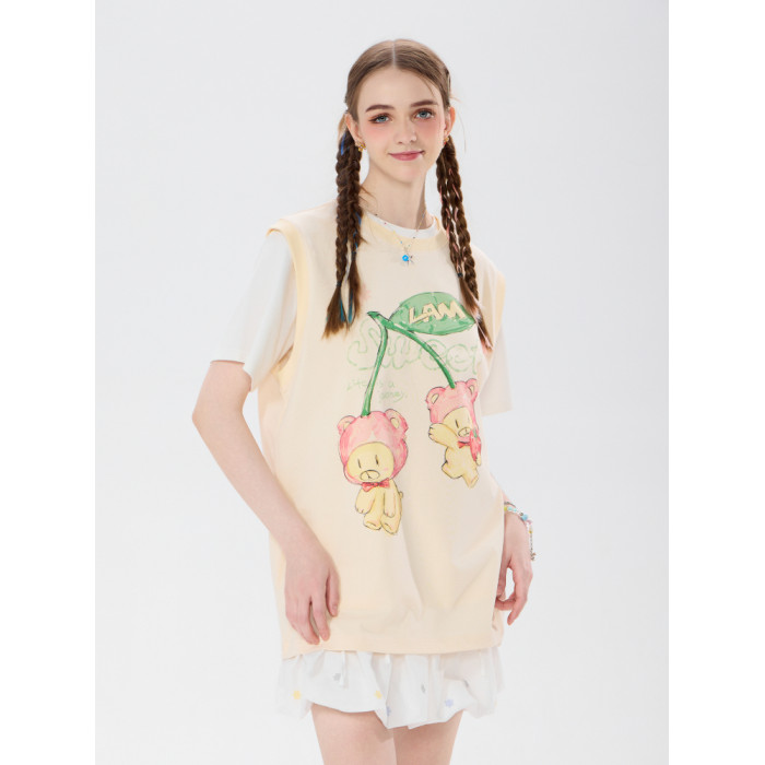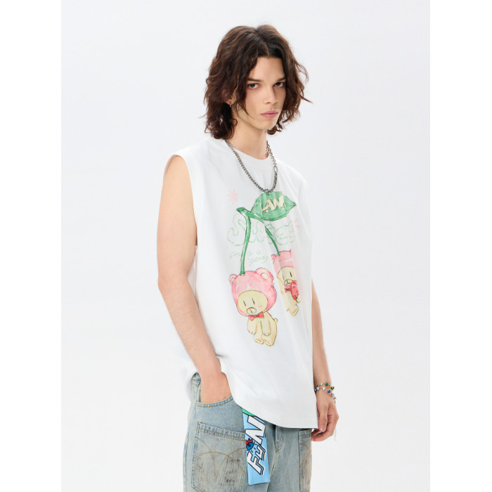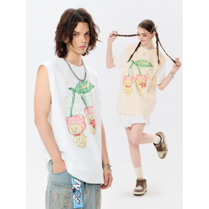 LAMLICKA櫻桃小熊坎肩背心女夏季潮牌美式純棉寬松白色無袖t恤男