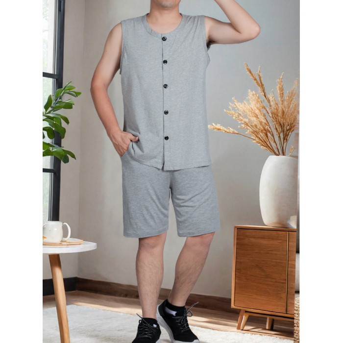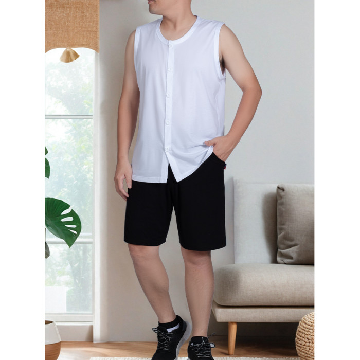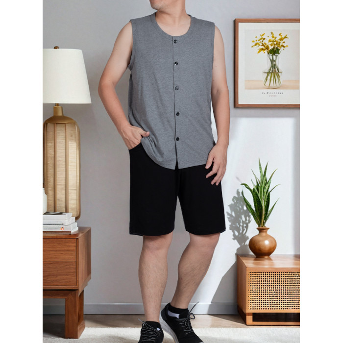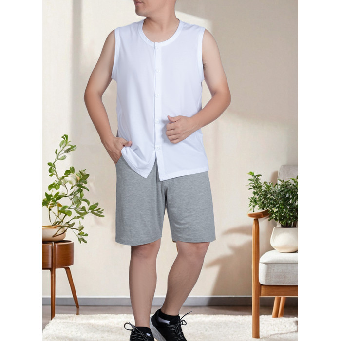 爸爸夏裝純棉開衫背心短褲套裝男中老年人爺爺休閒運動套裝老頭衫