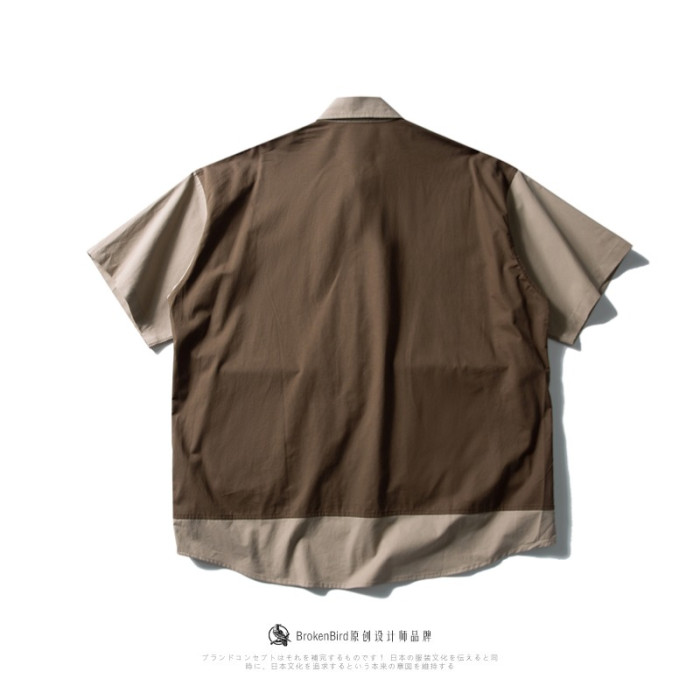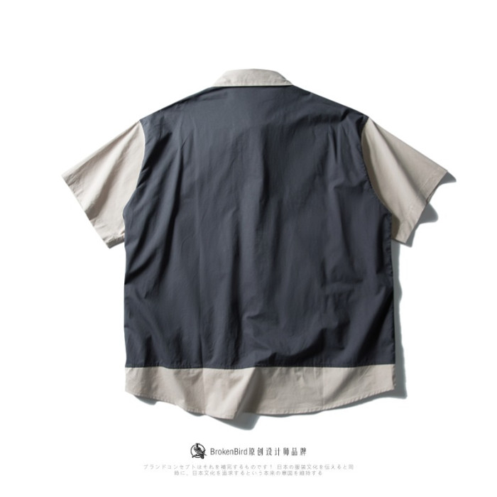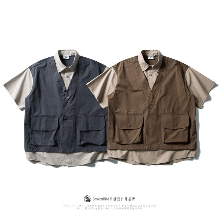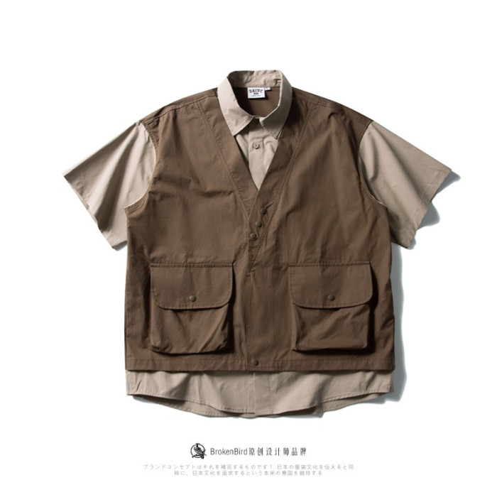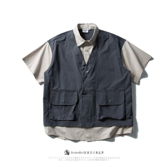 日系cityboy復古撞色拼接假兩件馬甲短袖襯衫男夏季休閒工裝襯衣