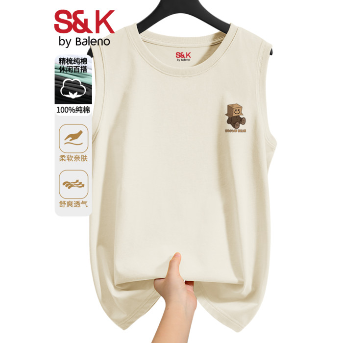 班尼路S&K系列淺米色無袖背心男夏季重磅純棉青少年美式運動坎肩A