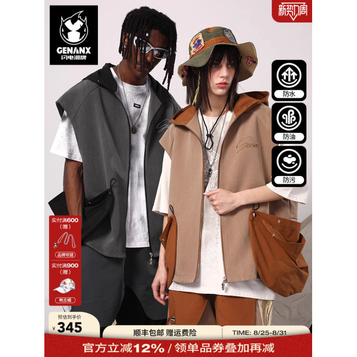 GENANX閃電潮牌新款一衣多穿防水防汙防油三防美潮山系連帽馬甲男