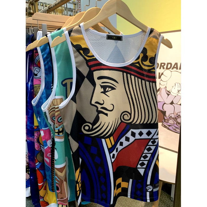 潮網眼運動背心男士寬松撲克K透氣網孔印花速乾跑步馬拉松背心