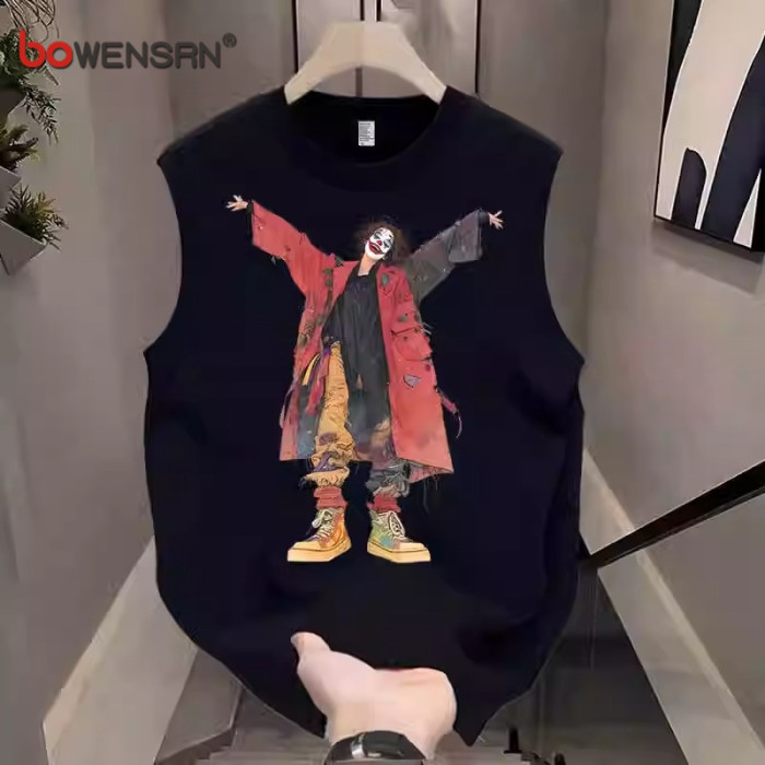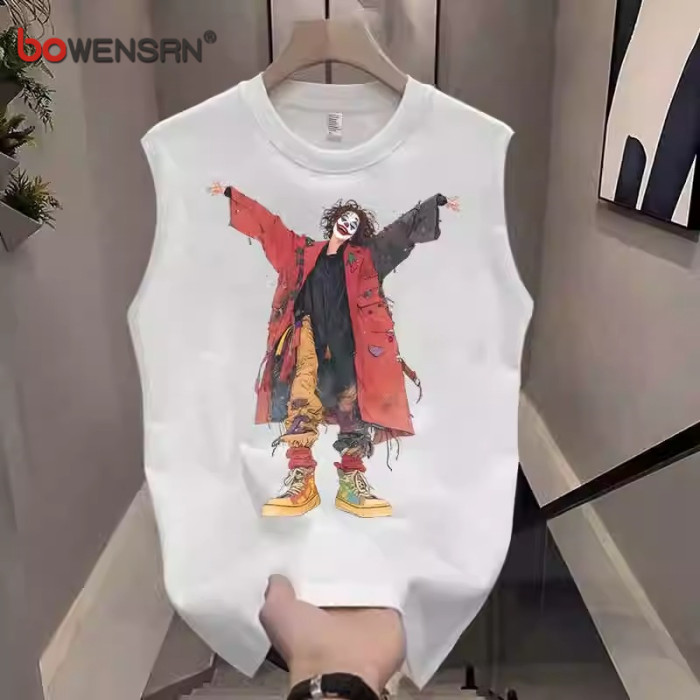 潮牌重磅純棉背心男士無袖t恤2025新款夏季寬松小醜印花坎肩男款