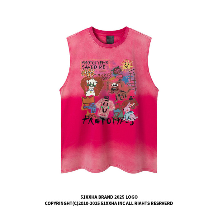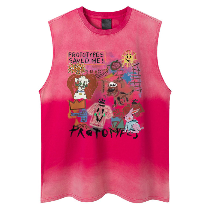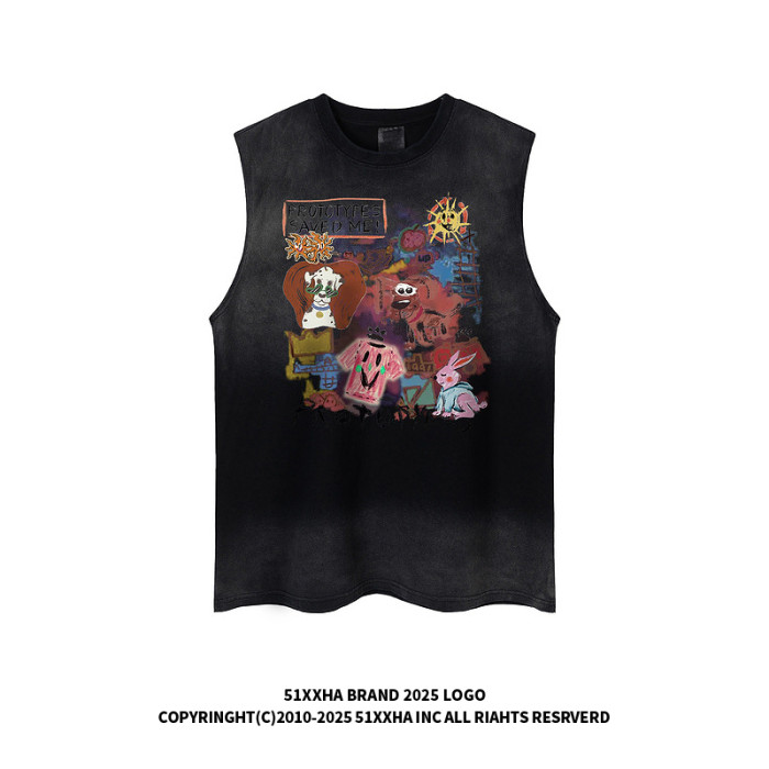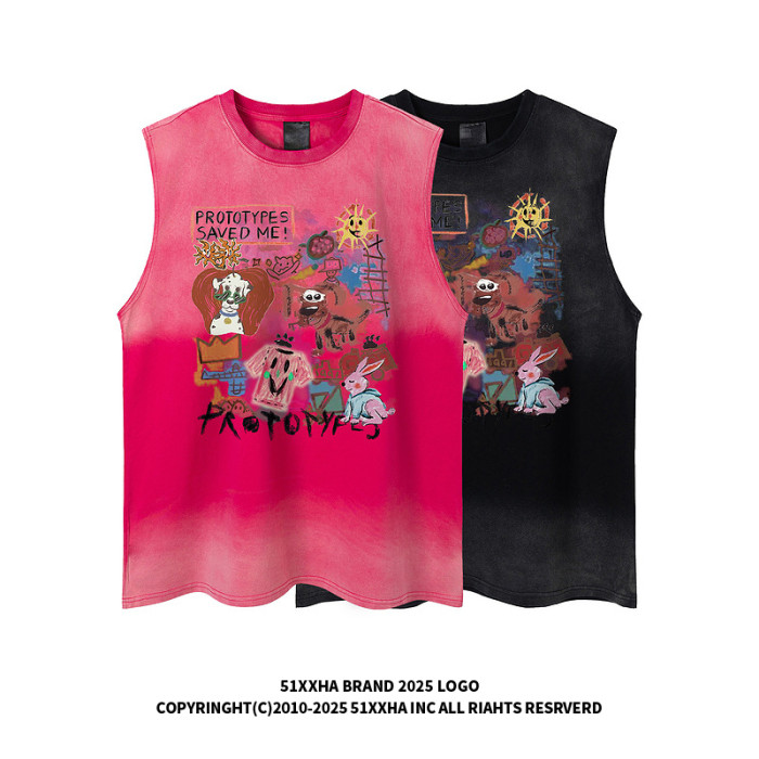 51嘻哈美式復古手繪卡通印花無袖T恤男潮牌做舊漸變寬松坎肩背心