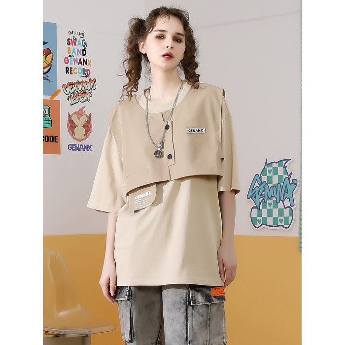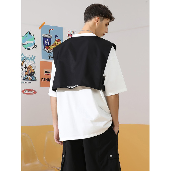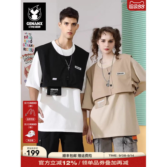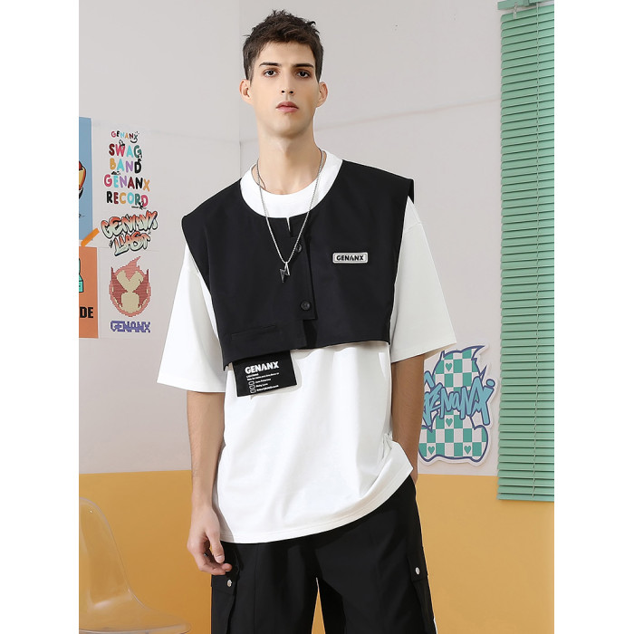 GENANX閃電潮牌夏季新款T恤解搆風兩件套馬甲T恤個性設計短袖